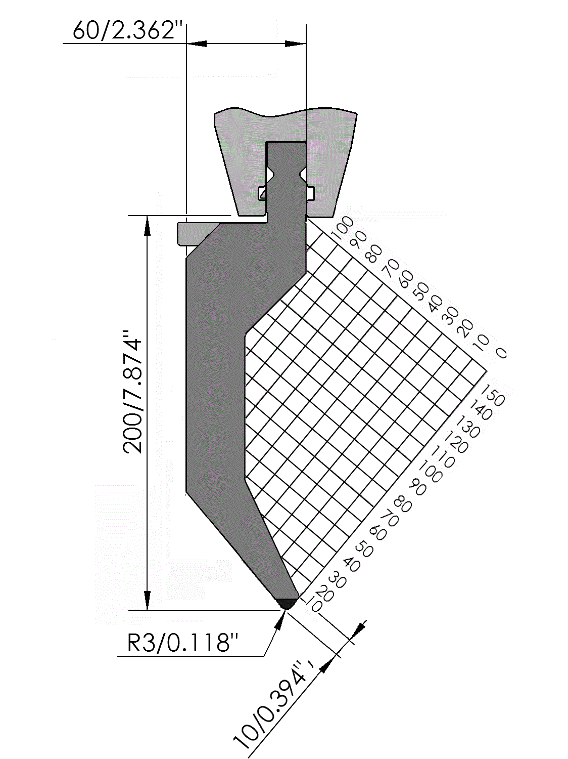 New Standard Premium top tool with Working height H=200mm, α=80°, Radius=3mm, precision ground and CNC-Deephardened® (at least 4mm / 56-60HRc), Material=CR-MO, Max. load=90ton/m. Parts <12.5kg provided with Safety-Clicks™, which allows you to change the tooling vertically; all other parts provided with fixed safety keys, which only allows you to change the tooling horizontally.
