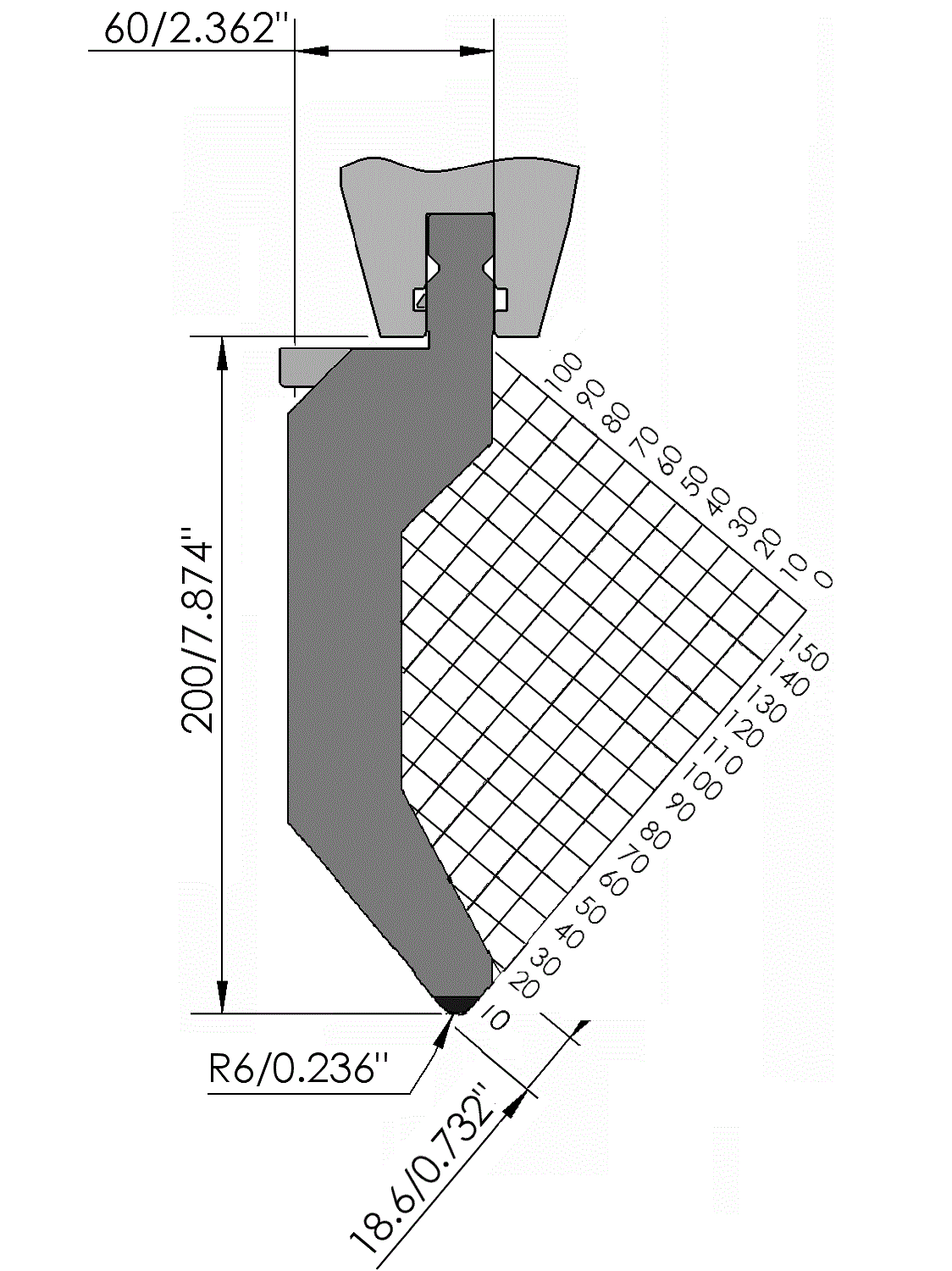 New Standard Premium top tool with Working height H=200mm, α=80°, Radius=6mm, precision ground and CNC-Deephardened® (at least 4mm / 56-60HRc), Material=CR-MO, Max. load=130ton/m. Parts <12.5kg provided with Safety-Clicks™, which allows you to change the tooling vertically; all other parts provided with fixed safety keys, which only allows you to change the tooling horizontally.