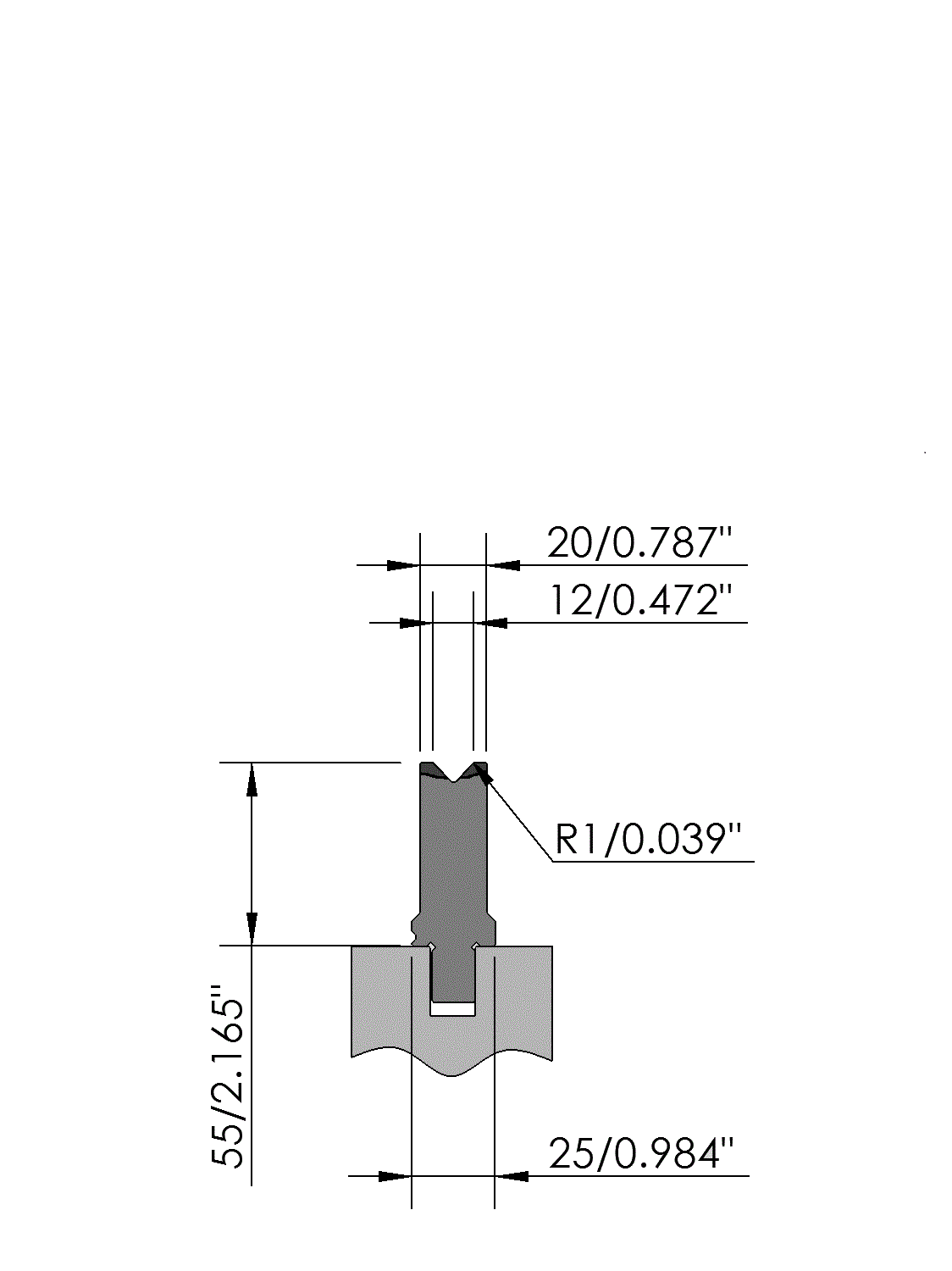 New Standard Premium bottom tool Working height=55mm, V-opening=12mm/86°, Bending radius=1mm, precision ground and CNC-Deephardened® (at least 4mm / 56-60HRc), Material=CR-MO