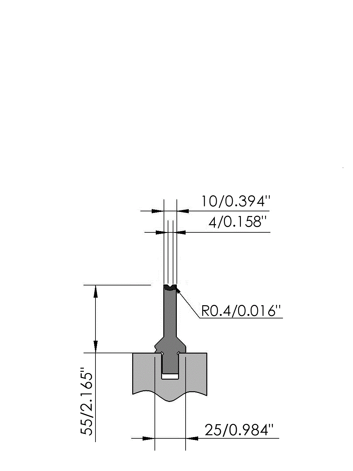 New Standard Premium bottom tool Working height=55mm, V-opening=4mm/86°, Bending radius=0.5mm, precision ground and CNC-Deephardened® (at least 4mm / 56-60HRc), Material=CR-MO