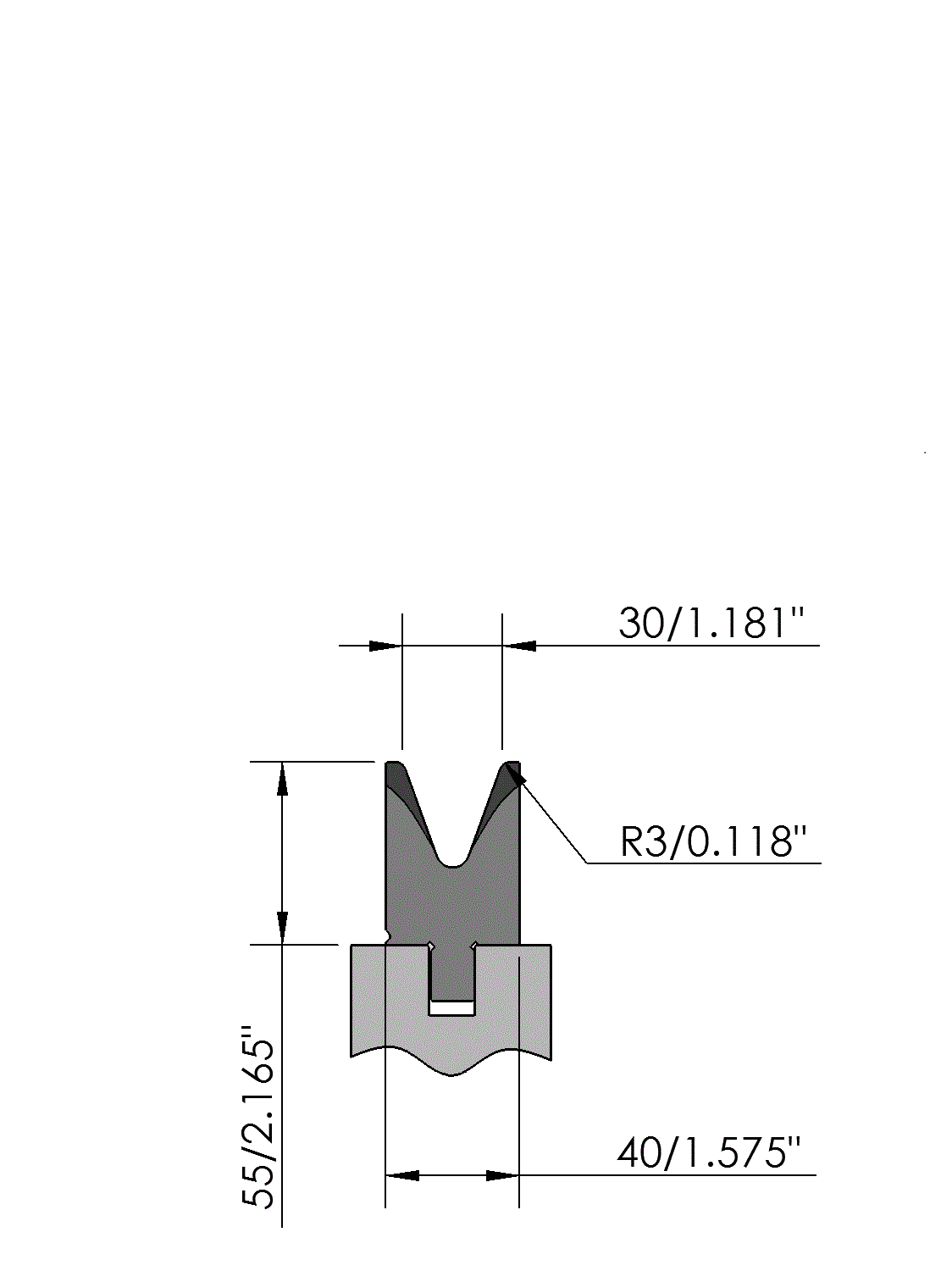 New Standard Premium bottom tool Working height=55mm, V-opening=30mm/40°, Bending radius=3mm, precision ground and CNC-Deephardened® (at least 4mm / 56-60HRc), Material=CR-MO