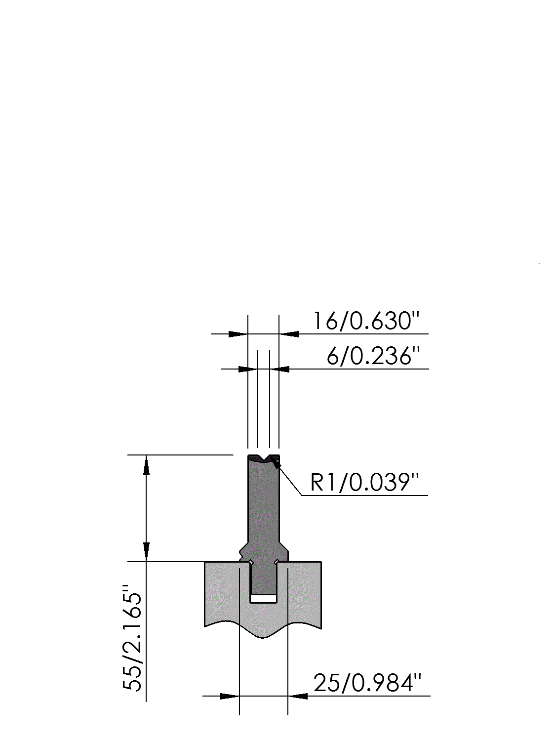 New Standard Premium bottom tool Working height=55mm, V-opening=6mm/90°, Bending radius=1mm, precision ground and CNC-Deephardened® (at least 4mm / 56-60HRc), Material=CR-MO