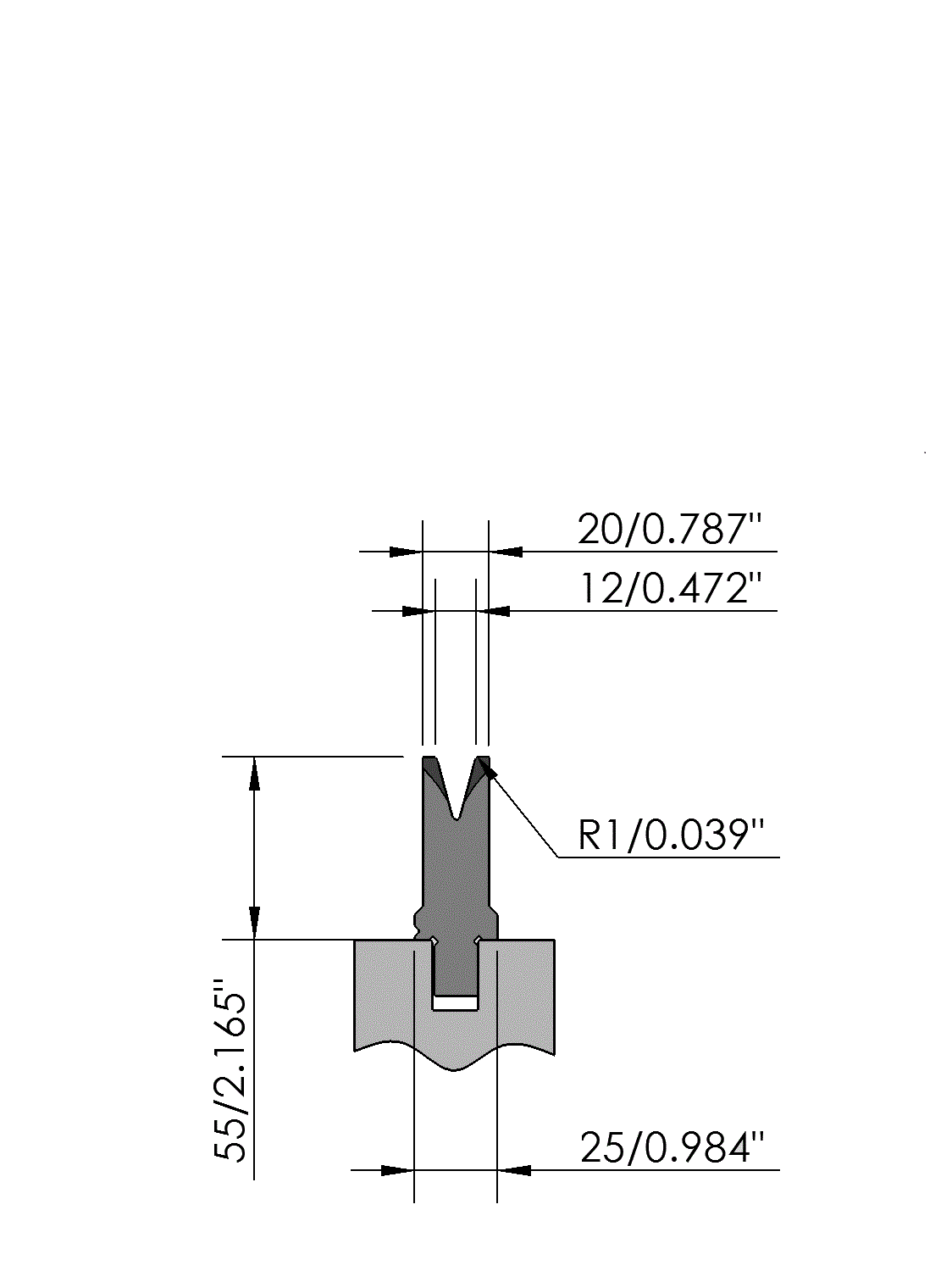 New Standard Premium bottom tool Working height=55mm, V-opening=12mm/30°, Bending radius=1mm, precision ground and CNC-Deephardened® (at least 4mm / 56-60HRc), Material=CR-MO