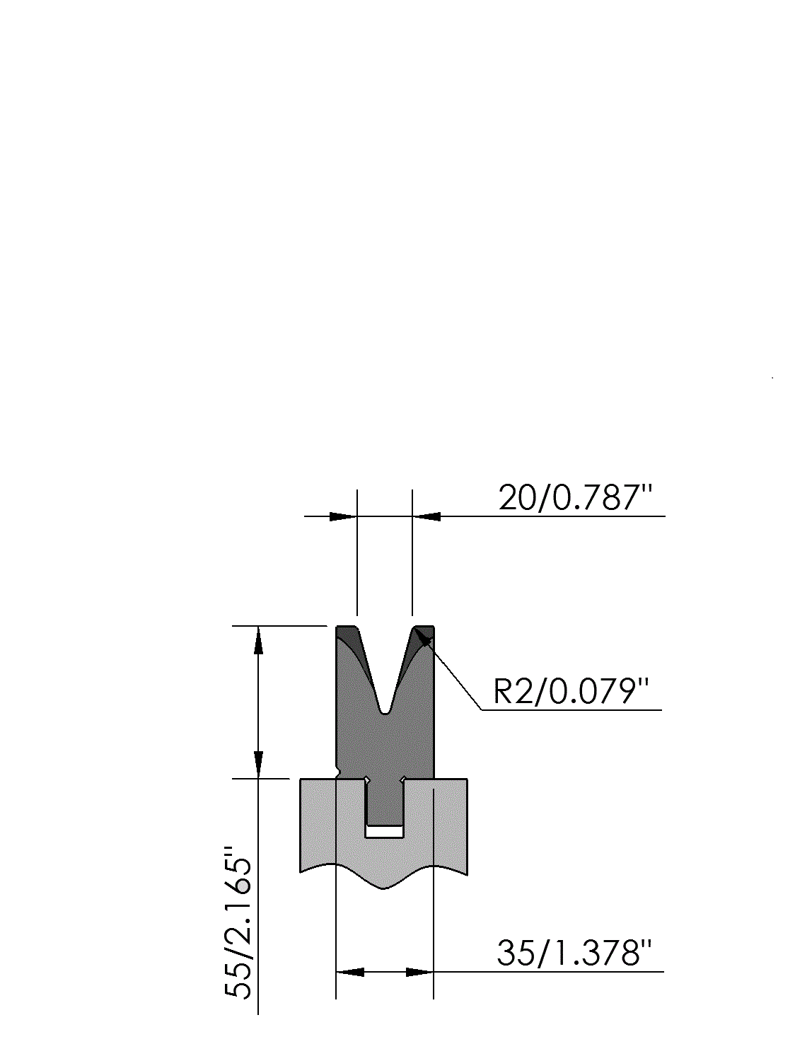 New Standard Premium bottom tool Working height=55mm, V-opening=20mm/30°, Bending radius=2mm, precision ground and CNC-Deephardened® (at least 4mm / 56-60HRc), Material=CR-MO