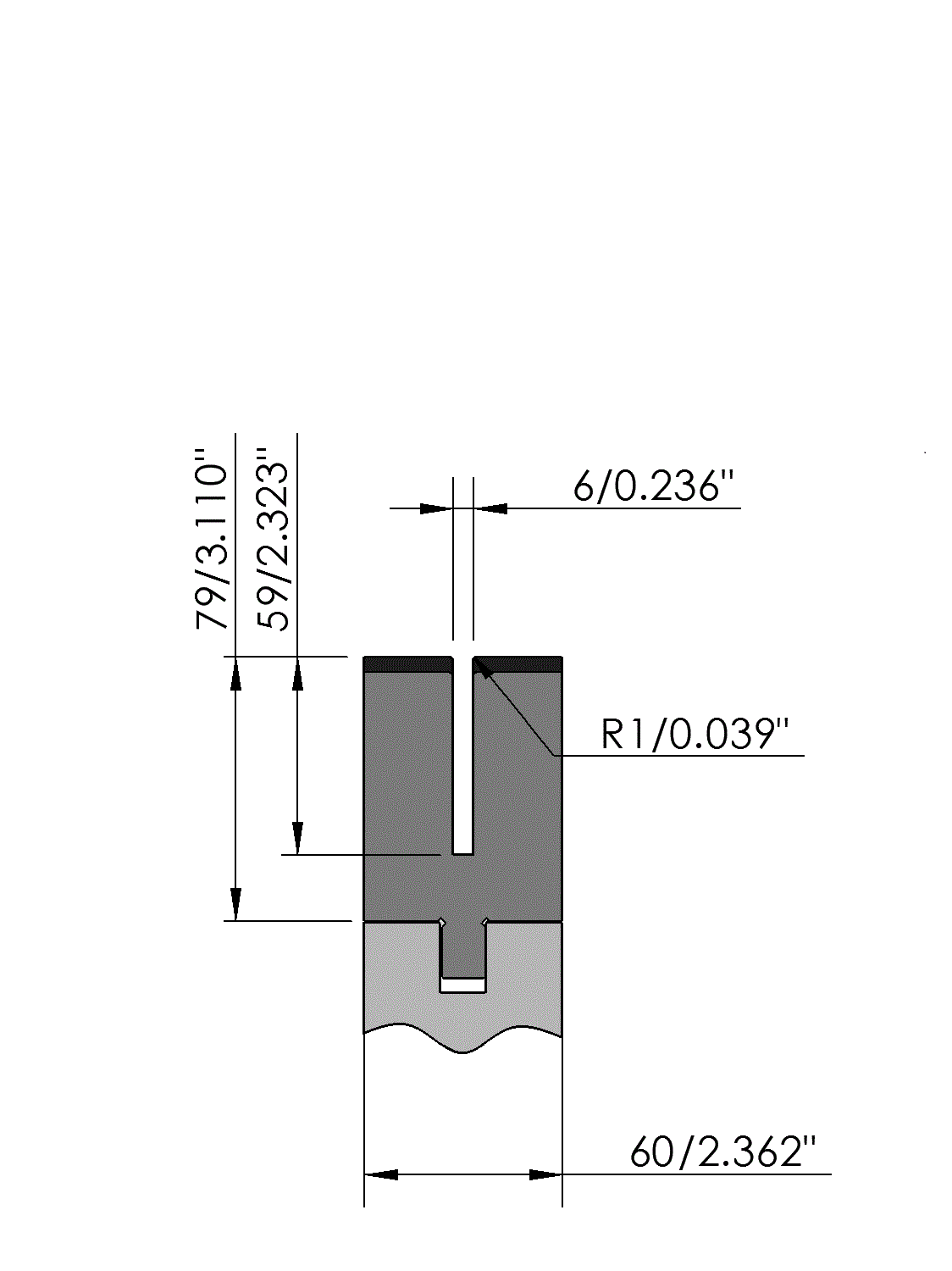 New Standard Premium bottom tool Working height=79mm, U-opening=6x59mm (BxD), Bending radius=1mm, precision ground and CNC-Deephardened® (at least 4mm / 56-60HRc), Material=CR-MO