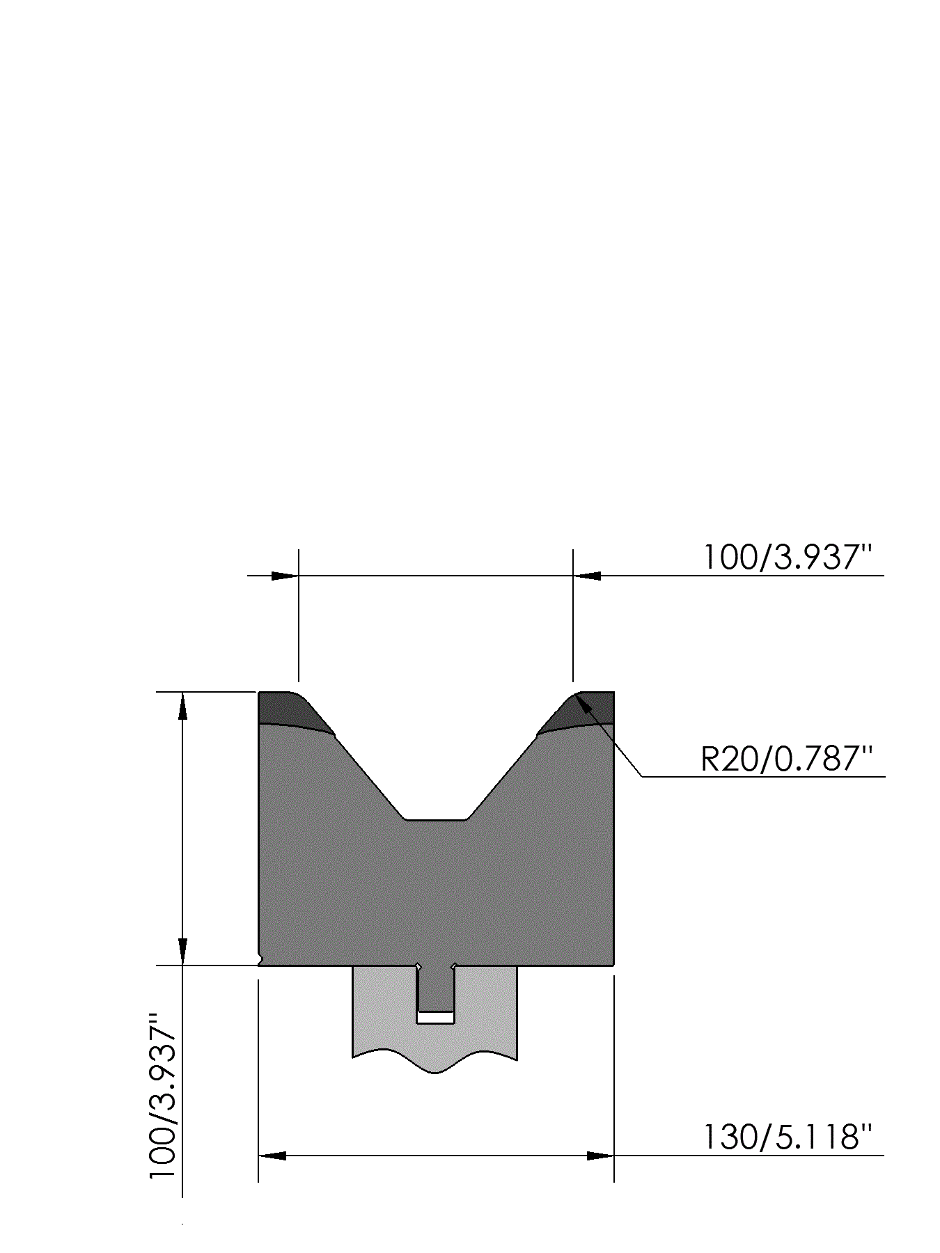 New Standard Premium bottom tool Working height=100mm, V-opening=100mm/80°, Bending radius=20mm, precision ground and CNC-Deephardened® (at least 4mm / 56-60HRc), Material=CR-MO