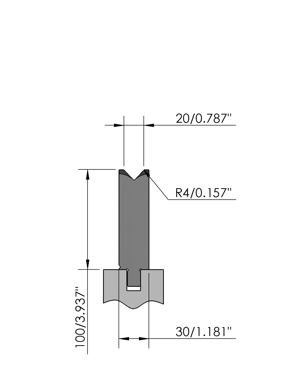 New Standard Premium bottom tool Working height=100mm, V-opening=20mm/86°, Bending radius=4mm, precision ground and CNC-Deephardened® (at least 4mm / 56-60HRc), Material=CR-MO