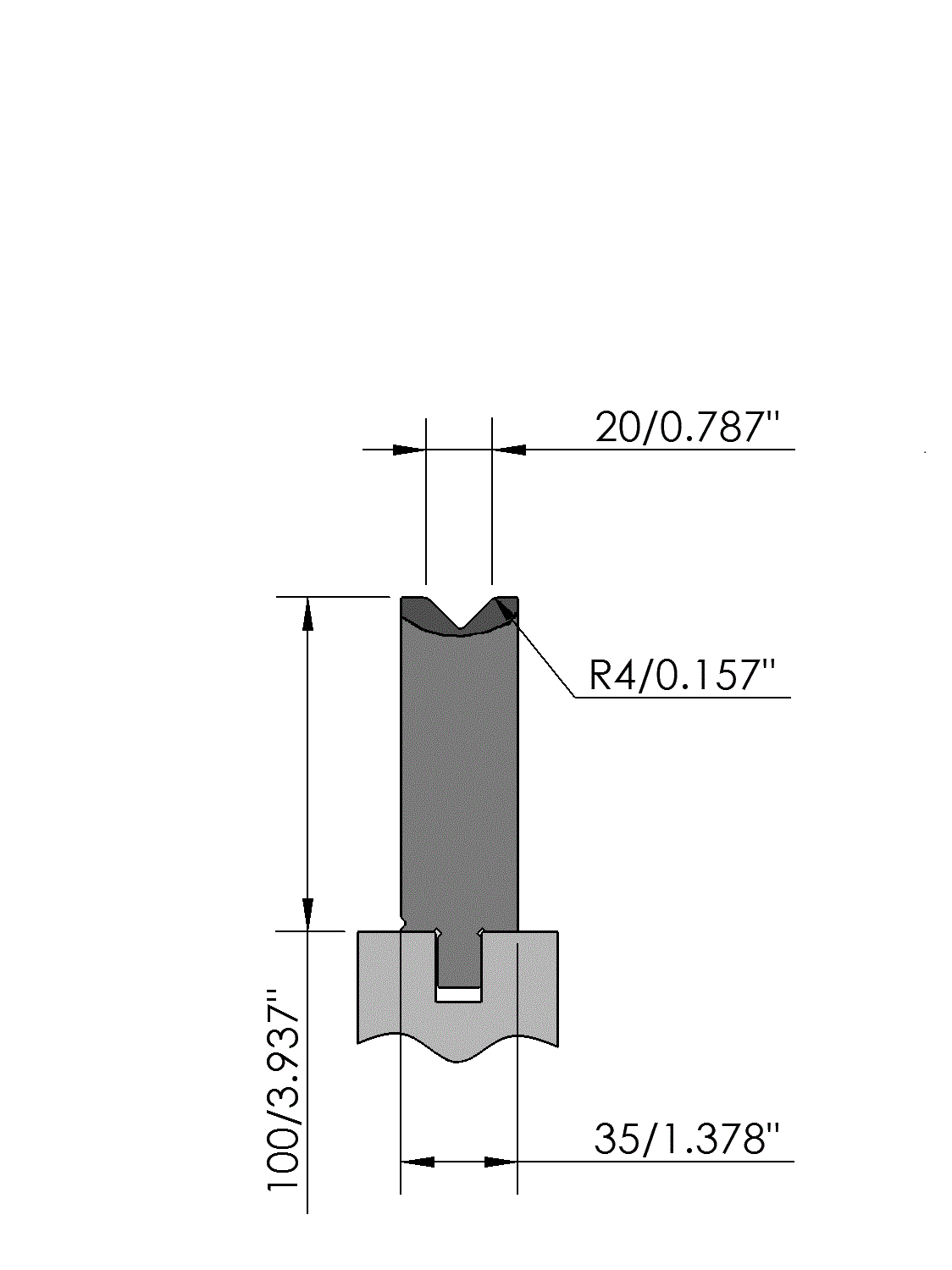 New Standard Premium bottom tool Working height=100mm, V-opening=20mm/90°, Bending radius=4mm, precision ground and CNC-Deephardened® (at least 4mm / 56-60HRc), Material=CR-MO