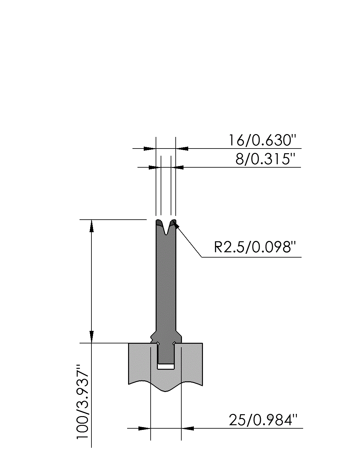 New Standard Premium bottom tool Working height=100mm, V-opening=8mm/30°, Bending radius=2.5mm, precision ground and CNC-Deephardened® (at least 4mm / 56-60HRc), Material=CR-MO