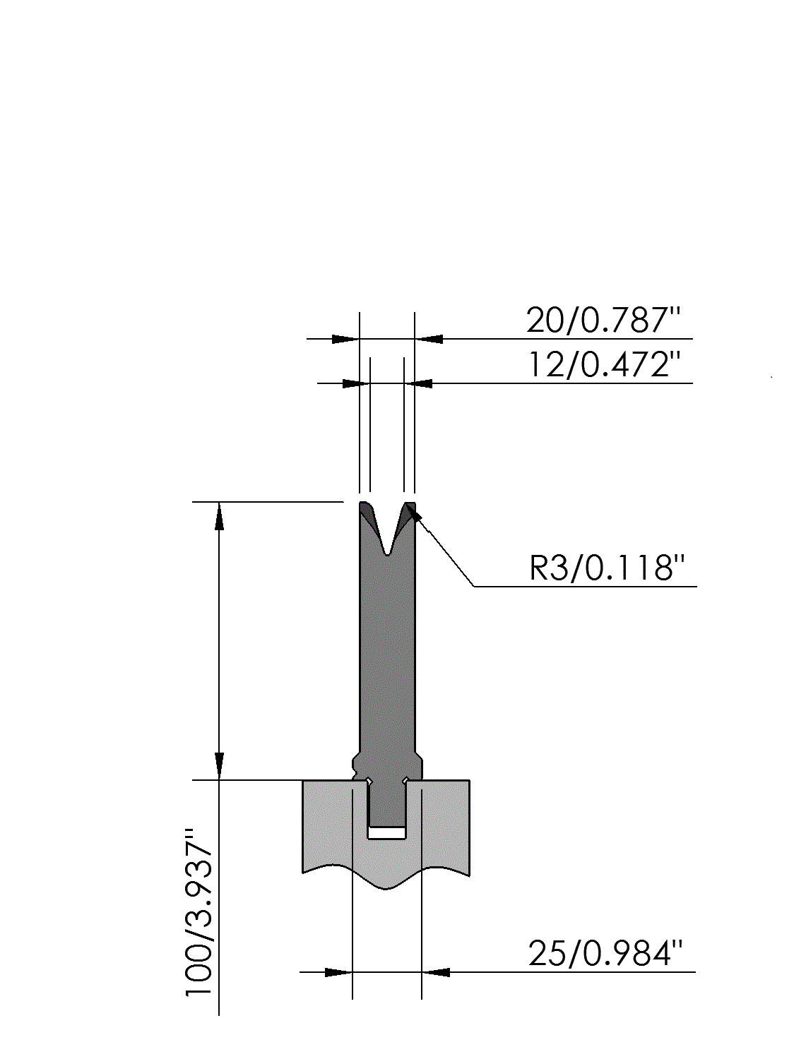 New Standard Premium bottom tool Working height=100mm, V-opening=12mm/30°, Bending radius=3mm, precision ground and CNC-Deephardened® (at least 4mm / 56-60HRc), Material=CR-MO