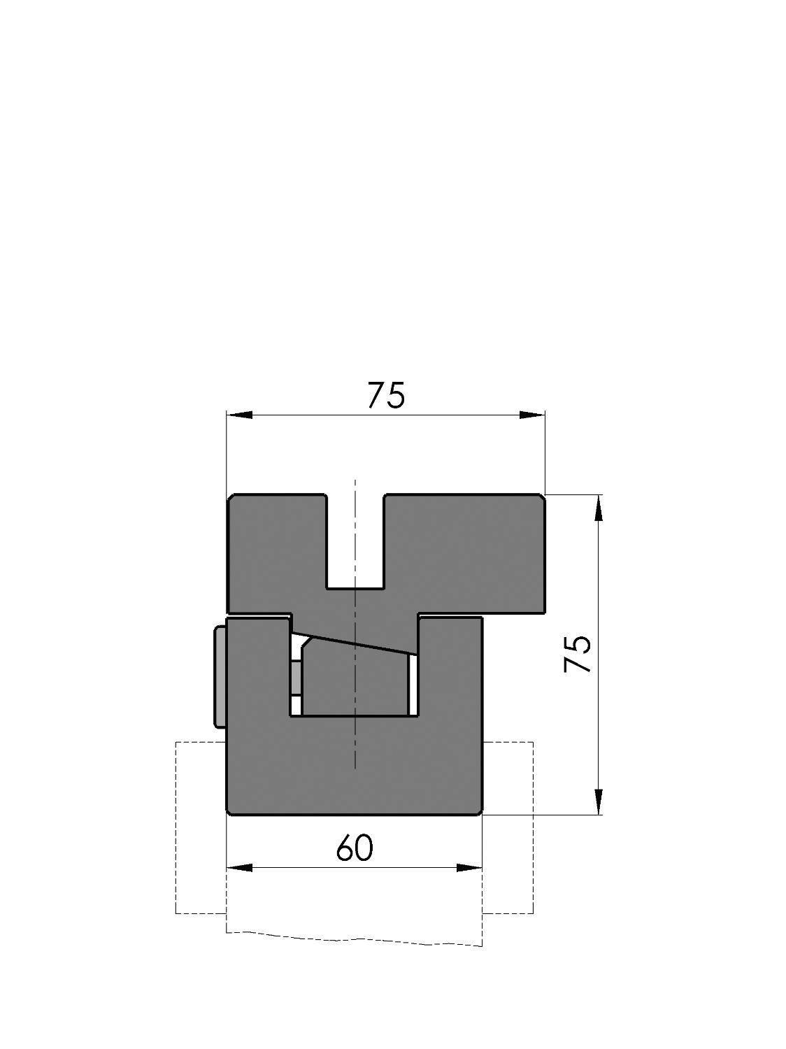 Working height=75mm, Width=60mm, provided with Amada adaptation Width=60.00mm, hydraulic clamping (max. 50bar), oil supply ø10mm, left-end, Ty-alignment (manually by means of single point adjustment), Material=C45 not hardened.