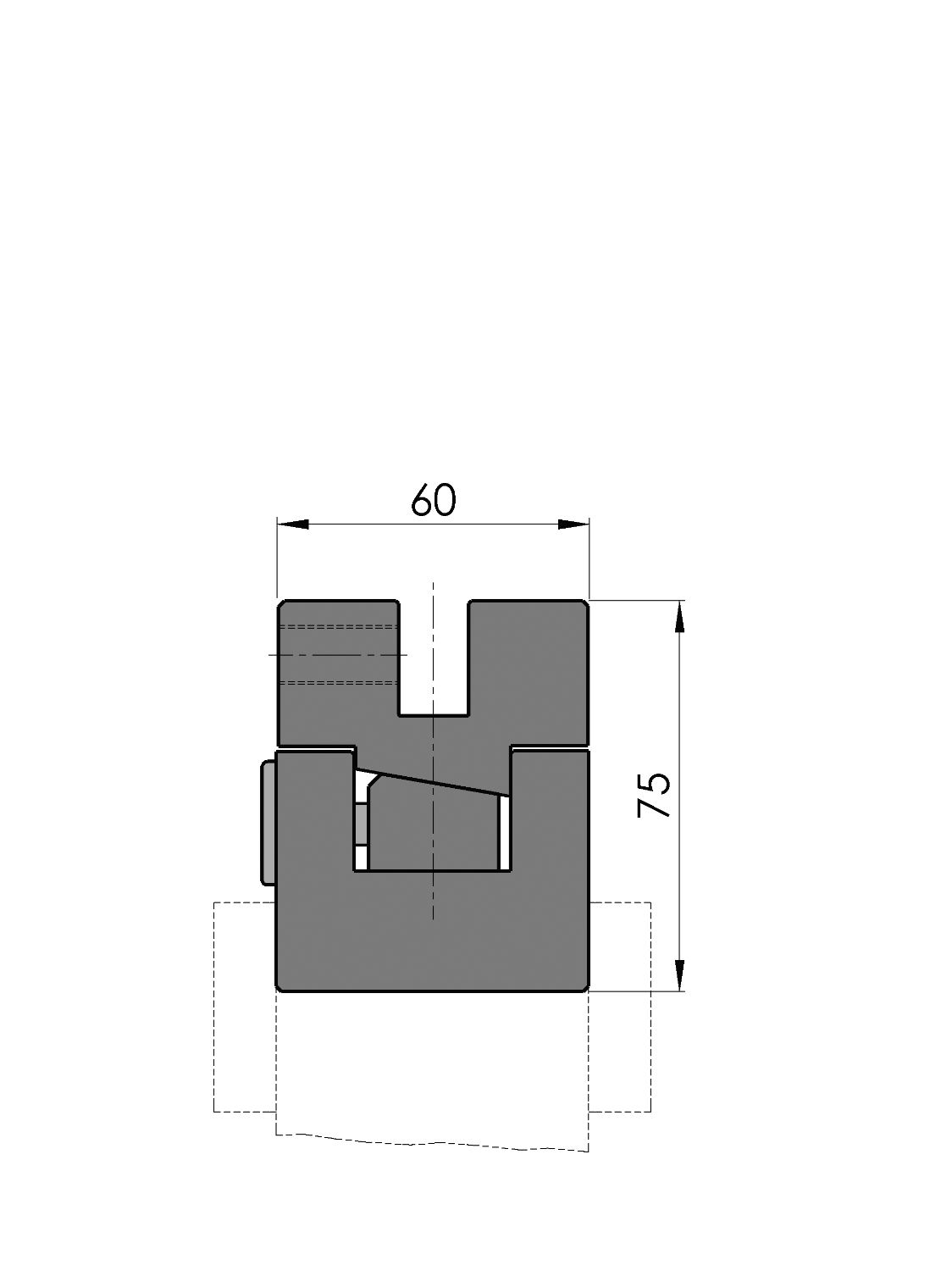 Working height=75mm, Width=60mm, provided with Amada adaptation Width=60.00mm, mechanical clamping by means of set screws M12 pitch 102mm with centre 1000mm pitch 25.50mm, Ty-alignment (manually by means of single point adjustment), Material=C45 not hardened.