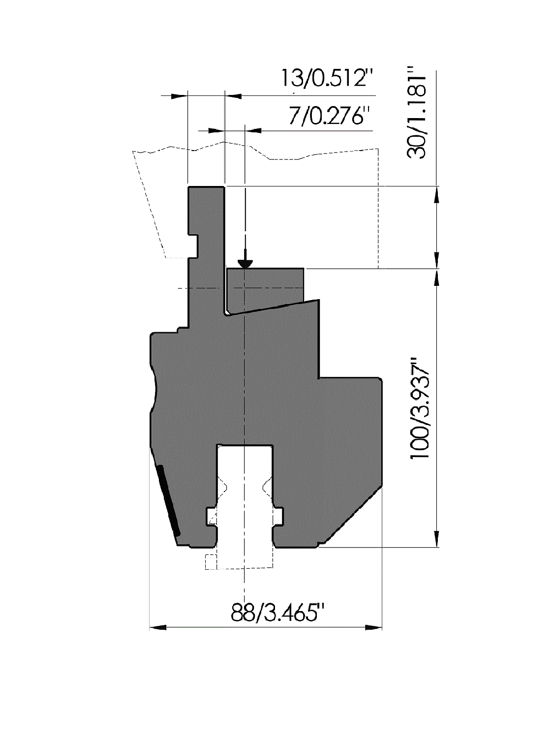 Working height=100mm, Width=88mm, provided with Amada adaptation (center line at 7mm) with crowning key (Ty-alignment), manually by means of push and pull screws, hydraulic clamping (max. 50bar), oil supply ø10mm, left end, Material=C45 not hardened.
