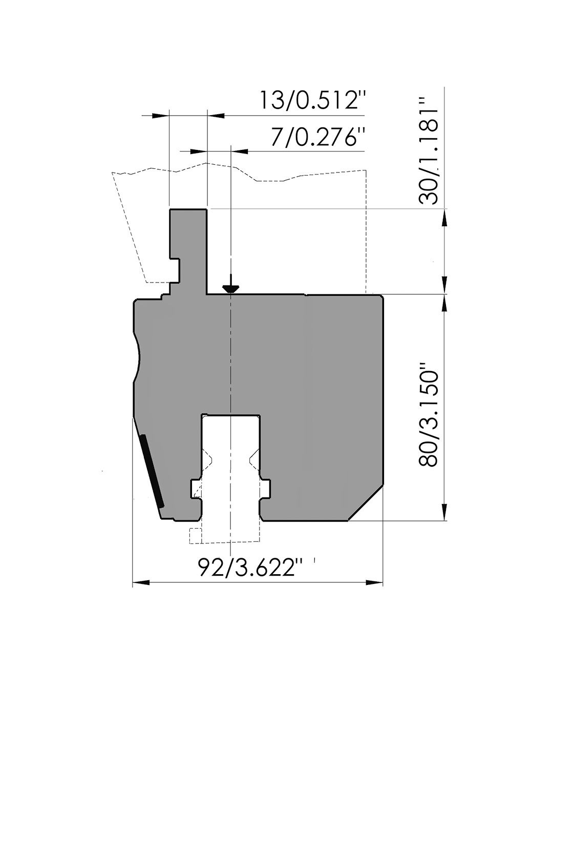 Working height=100mm, Width=92mm, provided with Amada adaptation (center line at 7mm) with crowning key (Ty-alignment), manually by means of push and pull screws, pneumatic clamping, left and right end, Material=C45 not hardened, Max. load=180ton/m.