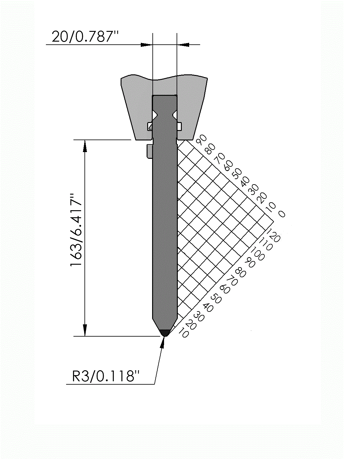New Standard Premium top tool provided with ATC-adapter, with Working height H=163mm, α=60°, Radius=3mm CNC-Deephardened® (at least 4mm / 56-60HRc), Material=CR-MO, Max. load=160ton/m. Parts <12.5kg provided with Safety-Clicks™, which allows you to change the tooling vertically; all other parts provided with fixed safety pins, which only allows you to change the tooling horizontally.