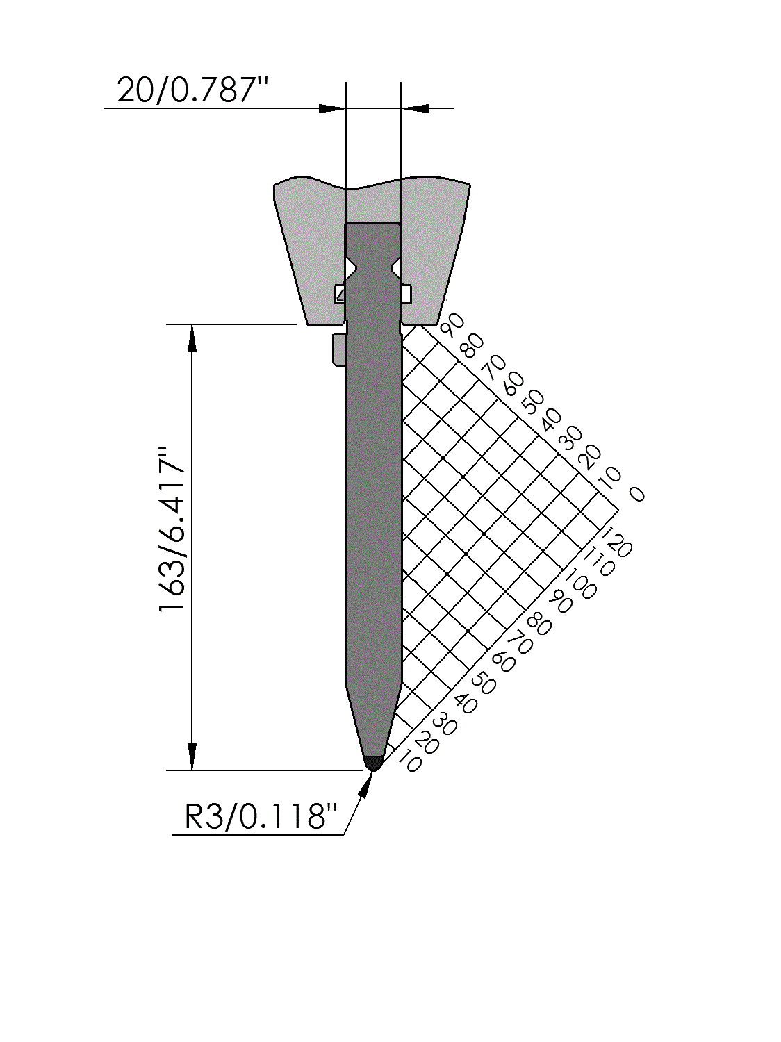 New Standard Premium top tool provided with ATC-adapter, with Working height H=163mm, α=28°, Radius=3mm CNC-Deephardened® (at least 4mm / 56-60HRc), Material=CR-MO, Max. load=160ton/m. Parts <12.5kg provided with Safety-Clicks™, which allows you to change the tooling vertically; all other parts provided with fixed safety pins, which only allows you to change the tooling horizontally.