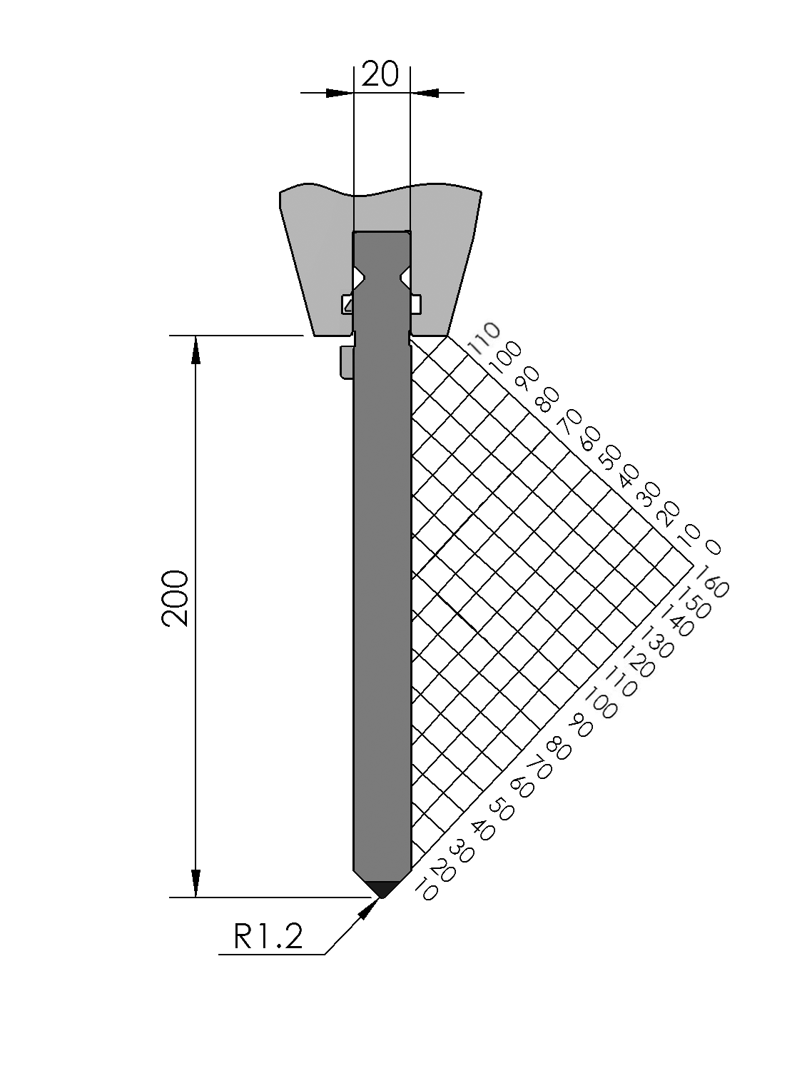 New Standard Premium top tool provided with WILA New Standard ATC, with Working height H=200mm, α=90°, Radius=1.2mm CNC-Deephardened® (at least 4mm / 56-60HRc), Material=CR-MO, Max. load=100ton/m. Provided with Safety-Clicks™, which allows you to change the tooling vertically.