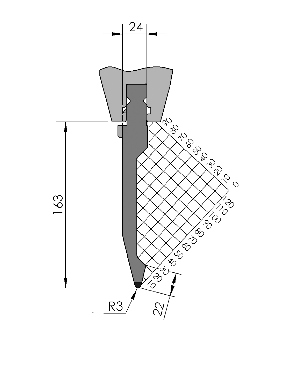 New Standard Premium top tool provided with ATC-adapter, with Working height H=163mm, α=28°, Radius=3mm CNC-Deephardened® (at least 4mm / 56-60HRc), Material=CR-MO, Max. load=100ton/m. Parts <12.5kg provided with Safety-Clicks™, which allows you to change the tooling vertically; all other parts provided with fixed safety pins, which only allows you to change the tooling horizontally.