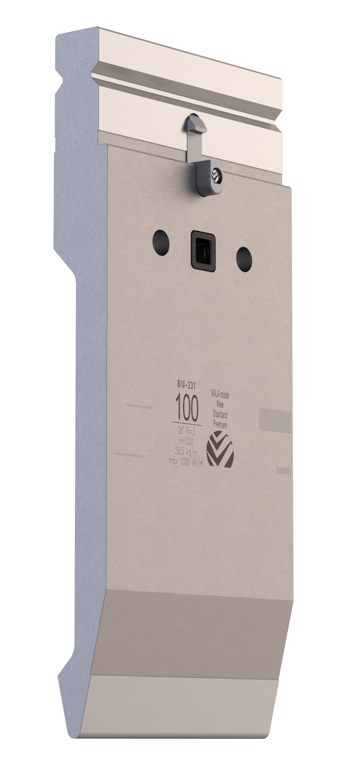 New Standard Premium top tool provided with ATC-adapter, with Working height H=200mm, α=28°, Radius=3mm CNC-Deephardened® (at least 4mm / 56-60HRc), Material=CR-MO, Max. load=100ton/m. Parts <12.5kg provided with Safety-Clicks™, which allows you to change the tooling vertically; all other parts provided with fixed safety pins, which only allows you to change the tooling horizontally.