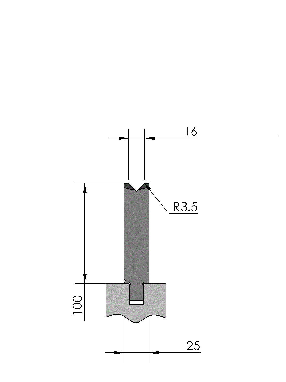 New Standard Premium bottom tool provided with ATC-adapter. Working height=100mm, V-opening=16mm/86°, Bending radius=3.5mm CNC-Deephardened® (at least 4mm / 56-60HRc), Material=CR-MO
