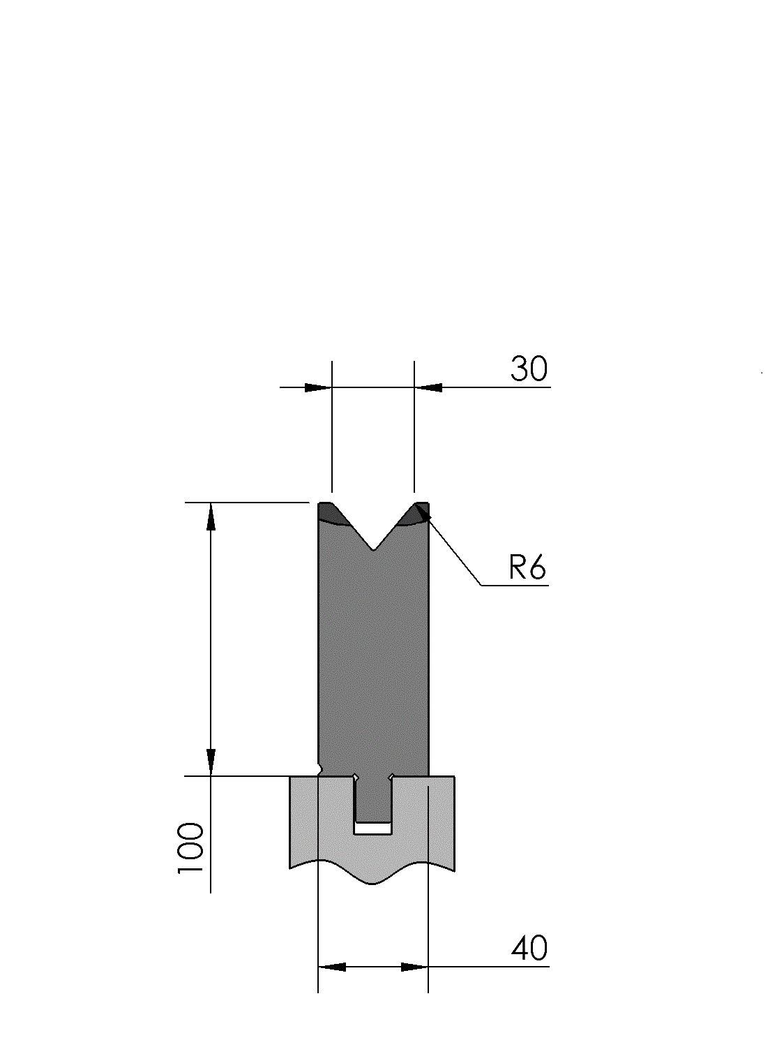 New Standard Premium bottom tool Working height=100mm, V-opening=30mm/80°, Bending radius=6mm CNC-Deephardened® (at least 4mm / 56-60HRc), Material=CR-MO