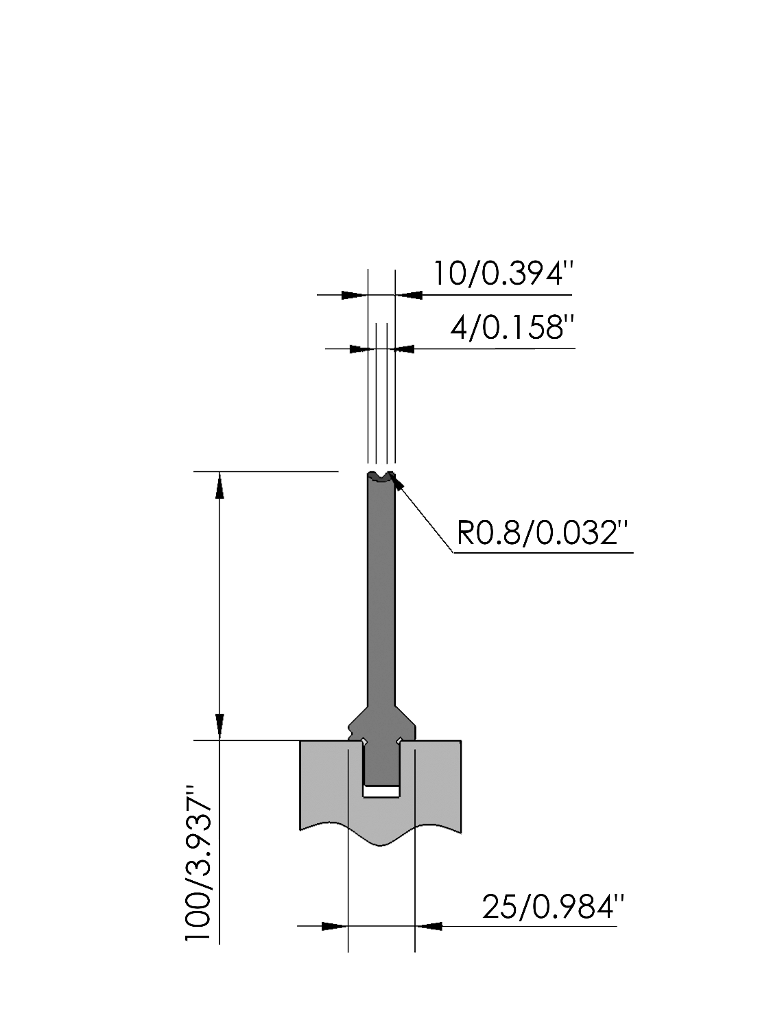 New Standard Premium bottom tool provided with ATC-adapter. Working height=100mm, V-opening=4mm/86°, Bending radius=0.8mm CNC-Deephardened® (at least 4mm / 56-60HRc), Material=CR-MO