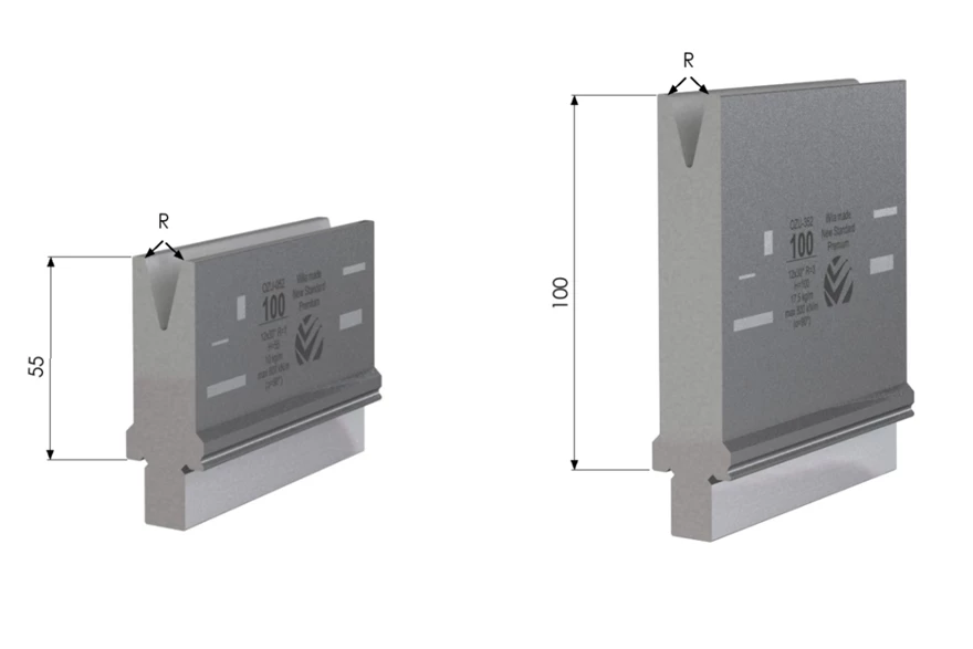 De grootte van de inloopradius is bij WILA New Standard Premium gereedschap standaard gekoppeld aan de werkhoogte. Gereedschap van 55mm hoog heeft een inloopradius van ongeveer 10% van de V-groefbreedte. Gereedschap van 100mm hoog heeft een inloopradius van ongeveer 20% van de V-groefbreedte.