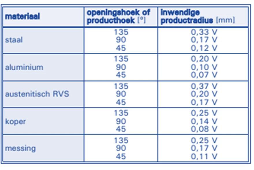 Maar hoe zit dat met andere materialen en hoeken? De gevormde inwendige radius is een percentage van de V-groefbreedte zoals te zien in de praktijkvoorbeelden in de tabel.