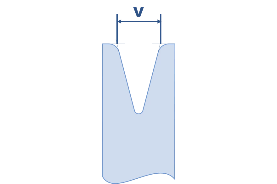 Als algemene vuistregel voor vrijbuigen van staal geldt dat u een V-groefbreedte kiest van 6-8 keer de plaatdikte. Door hier van af te wijken kunt u de productradius, de benodigde buigkracht, mate van aftekening en minimale beenlengte beïnvloeden. Maar let er op dat een gewijzigde V-groef ook gevolgen heeft voor de plaatuitslag.