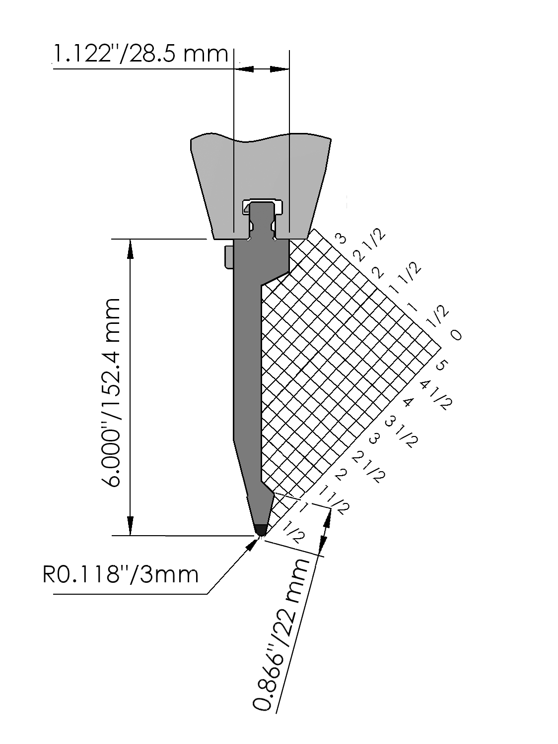 American Style bovengereedschap met Werkhoogte=152.4mm, α=28°, Radius=3mm, geslepen en CNC-diepgehard® (minimaal 4mm / 52-60HRc), Materiaal=CR-MO, Max. belasting=100ton/m. Voorzien van Safety-Clicks®, waardoor de gereedschappen snel, makkelijk en veilig verticaal te wisselen zijn.