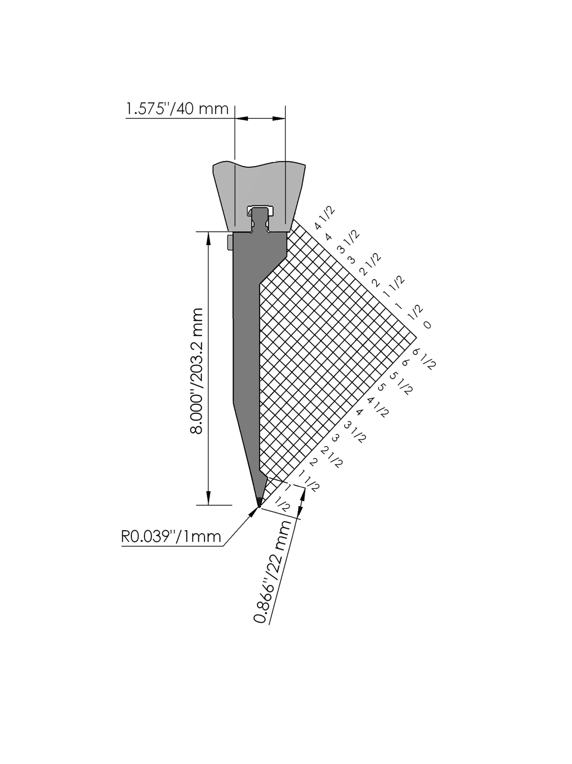 American Style bovengereedschap met Werkhoogte=203.2mm, α=28°, Radius=1mm, geslepen en CNC-diepgehard® (minimaal 4mm / 52-60HRc), Materiaal=CR-MO, Max. belasting=70ton/m. Deelstukken <12.5kg voorzien van Safety-Clicks®, waardoor deze snel, makkelijk en veilig verticaal te wisselen zijn; overige voorzien van veiligheidspennen, waardoor deze slechts horizontaal te wisselen zijn.