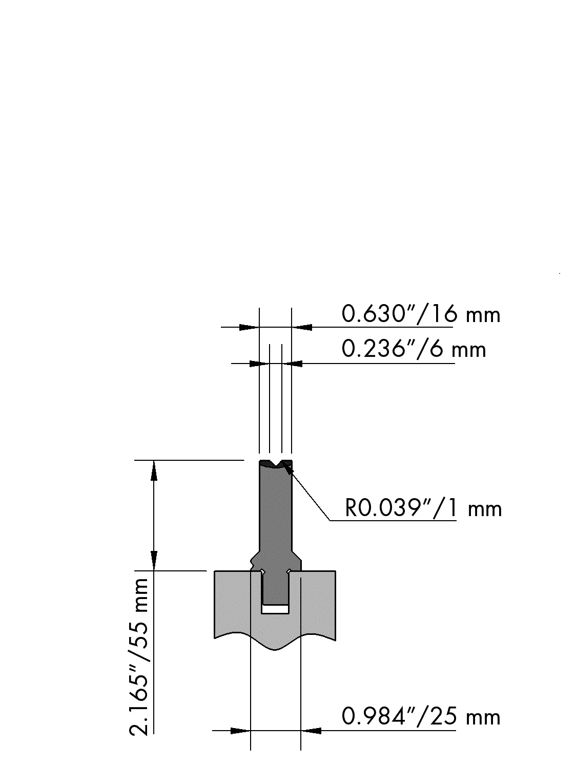 American Style ondergereedschap met Werkhoogte=55mm, V-opening=6mm/90°, Buigradius=1mm, geslepen en CNC-diepgehard® (minimaal 4mm / 52-60HRc), Materiaal=CR-MO.