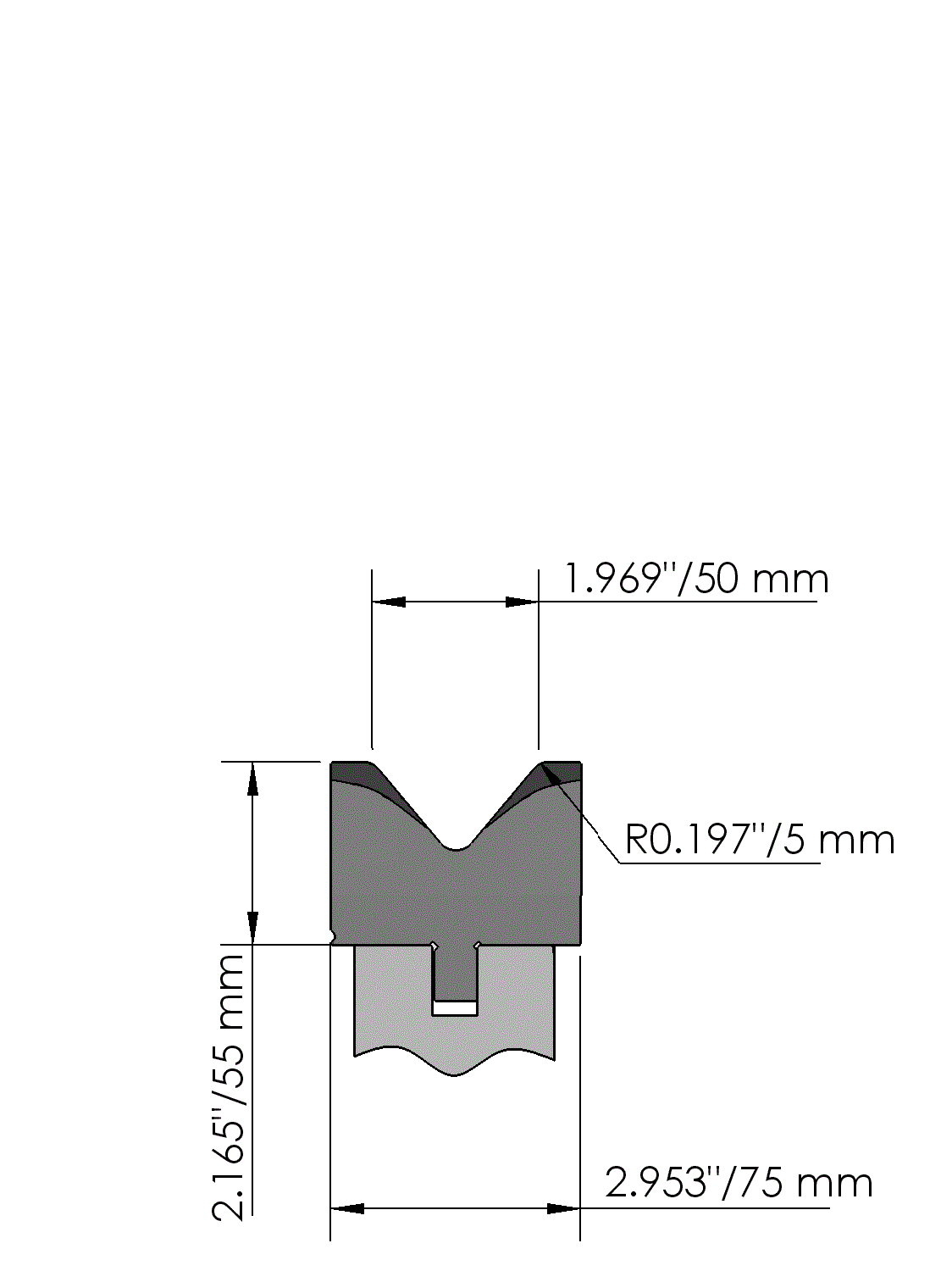 American Style ondergereedschap met Werkhoogte=55mm, V-opening=50mm/80°, Buigradius=5mm, geslepen en CNC-diepgehard® (minimaal 4mm / 52-60HRc), Materiaal=CR-MO.