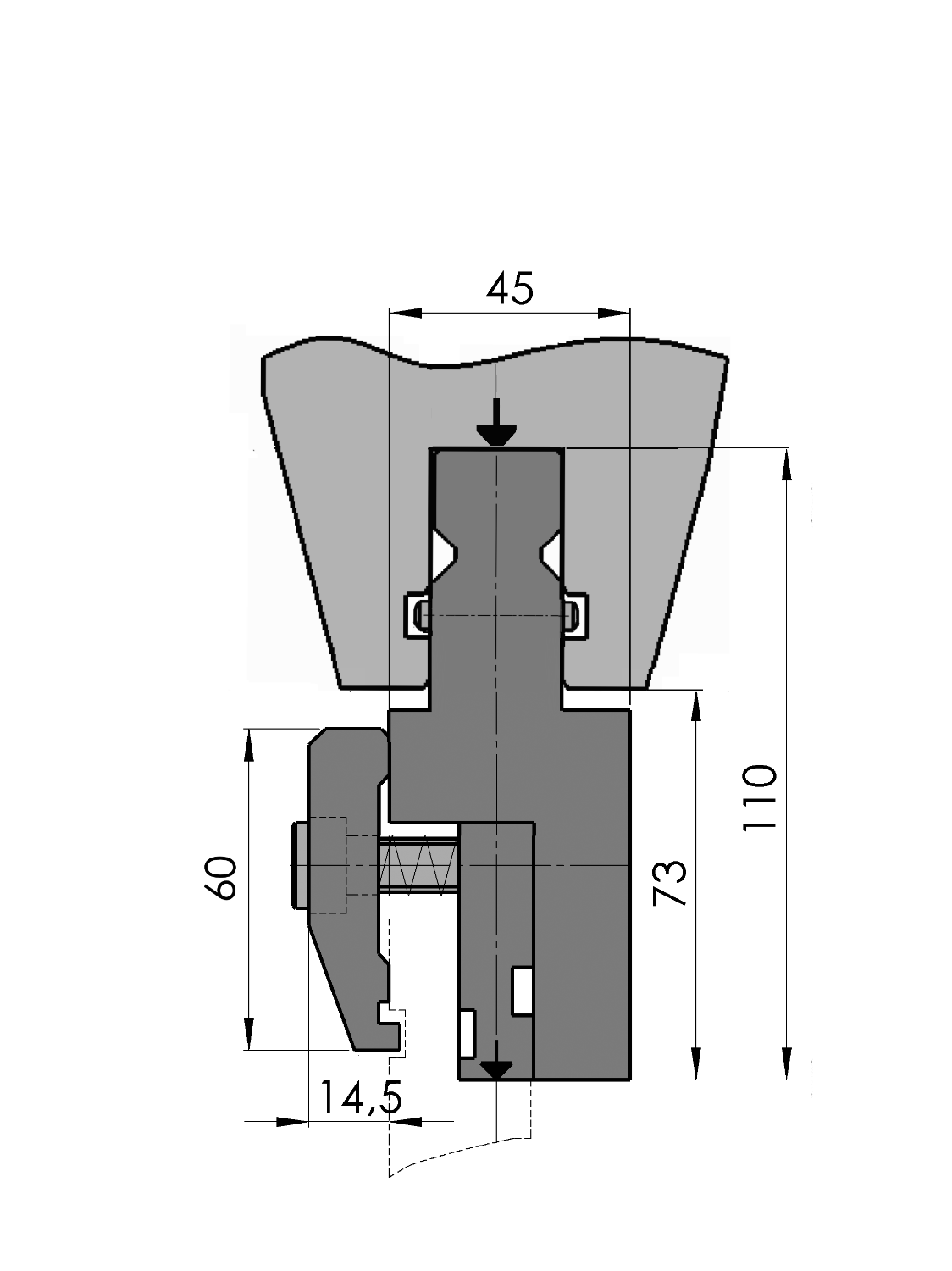 Werkhoogte=73mm, Breedte=61.5mm, Materiaal=C45, ongehard, Gewicht=30.16kg/m, Max. belasting=100ton/m.