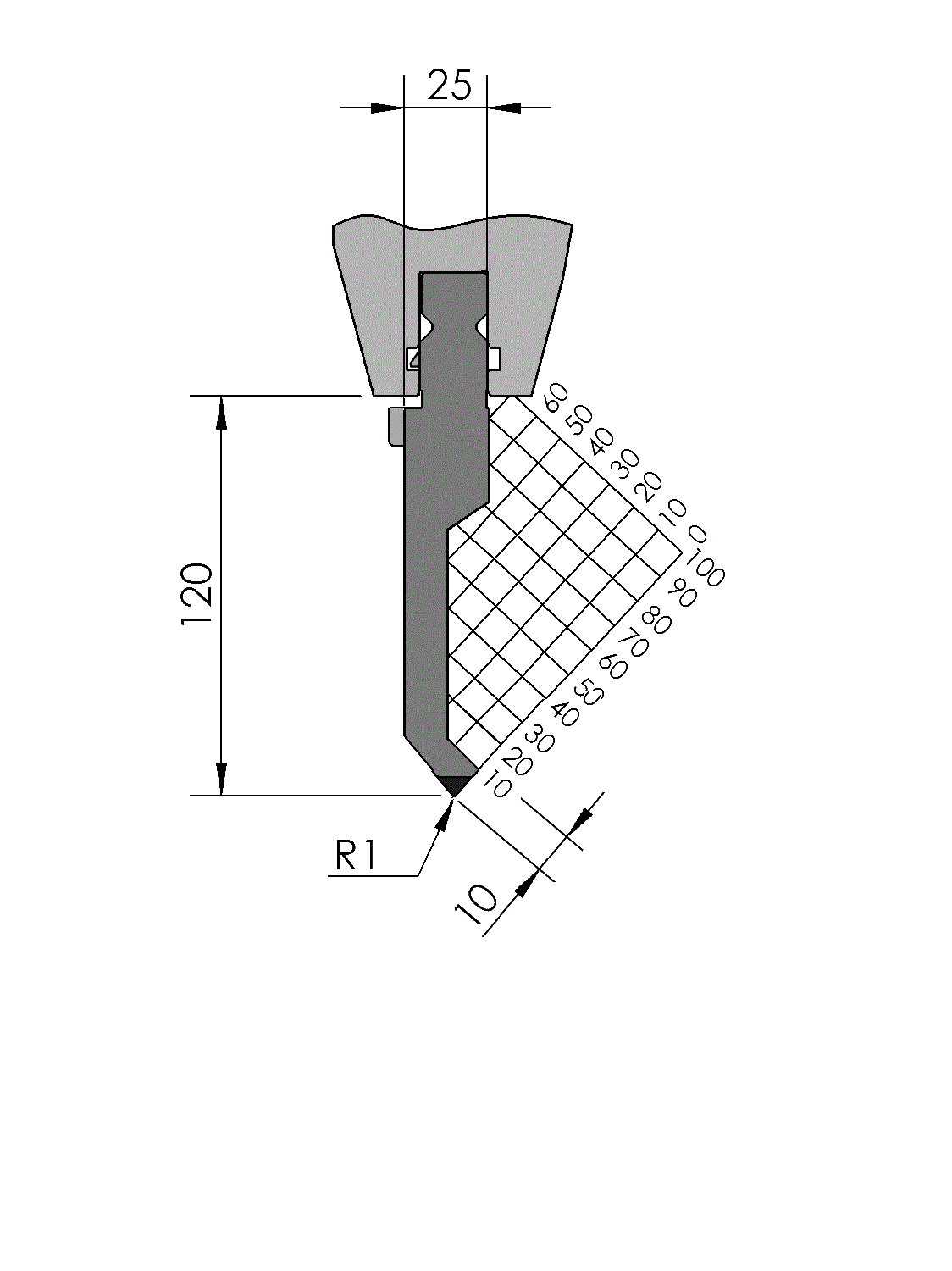 New Standard Premium bovengereedschap met Werkhoogte=120mm, α=80°, Radius=1mm, geslepen en CNC-diepgehard® (minimaal 4mm / 56-60HRc), Materiaal=CR-MO, Max. belasting=100ton/m. Voorzien van Safety-Clicks®, waardoor de gereedschappen snel, makkelijk en veilig verticaal te wisselen zijn.