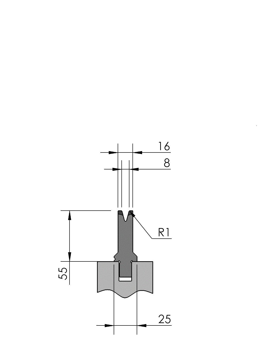 New Standard Premium ondergereedschap met Werkhoogte=55mm, V-opening=8mm/30°, Buigradius=1mm, geslepen en CNC-diepgehard® (minimaal 4mm / 56-60HRc), Materiaal=CR-MO