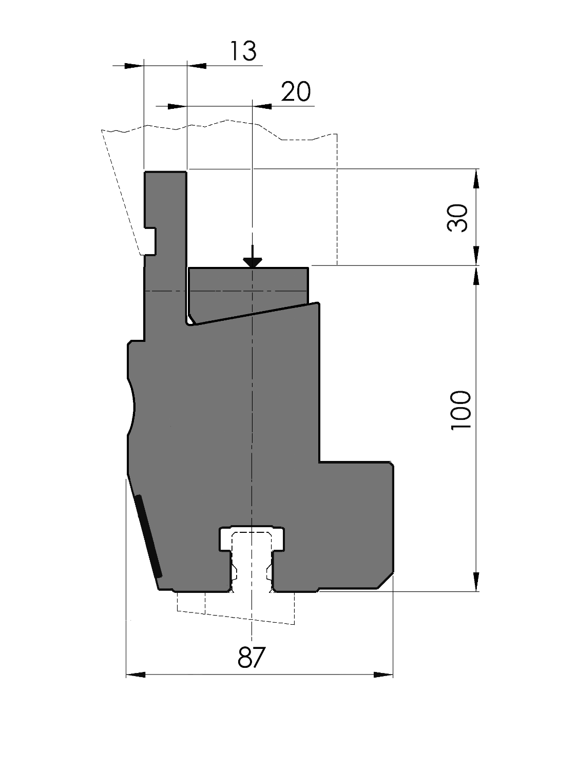 Werkhoogte=100mm, Breedte=87mm, voorzien van Amada bovenopname (hartlijnligging op 20mm) met stelspie (Ty-uitlijning), handmatige bediening d.m.v. trek- en drukbouten, hydraulische klemming (max. 50bar), olietoevoer ø10mm, Aansluiting : links kopzijde, Materiaal=C45 ongehard, Gewicht=43kg/m, Max. belasting=230ton/m.