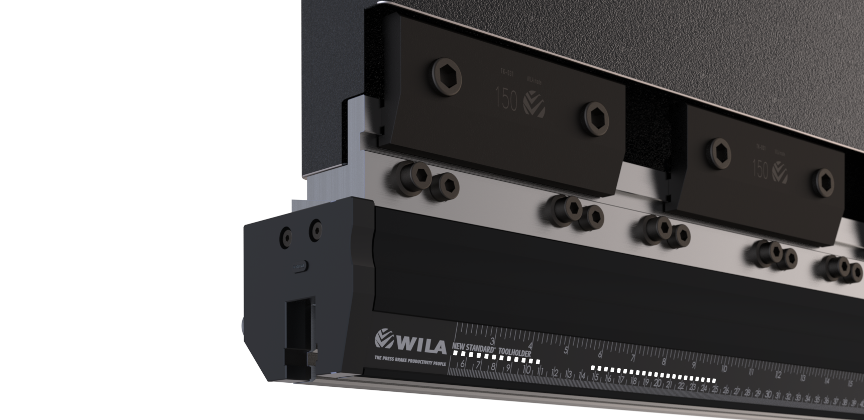 Werkhoogte=100mm, Breedte=93mm, voorzien van Amada bovenopname (hartlijnligging op 20mm) met stelspie (Ty-uitlijning), handmatige bediening d.m.v. trek- en drukbouten, hydraulische klemming (max. 50bar), olietoevoer ø10mm, Aansluiting : links kopzijde, Materiaal=C45 ongehard, Gewicht=48kg/m, Max. belasting=250ton/m.