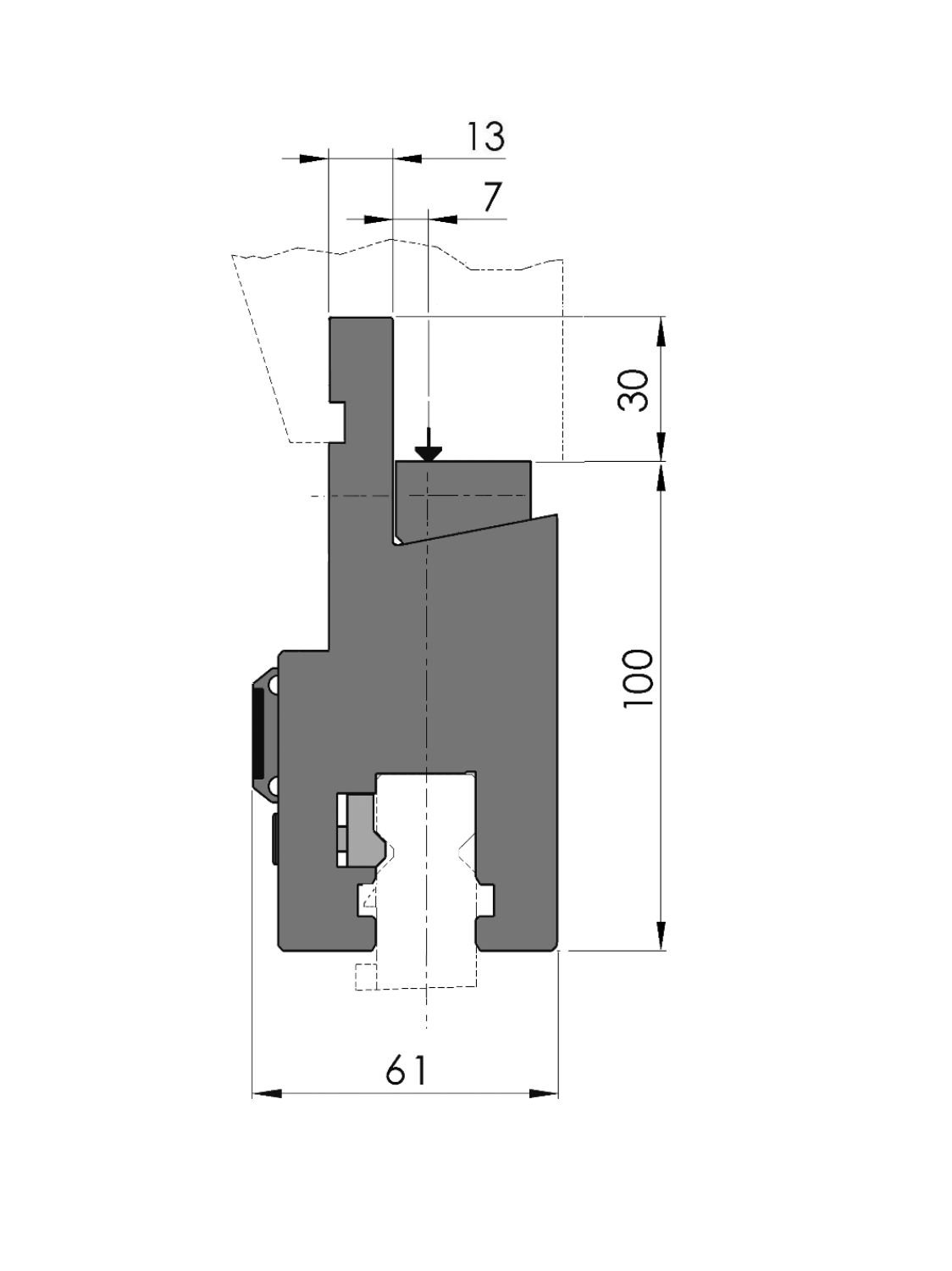 Werkhoogte=100mm, Breedte=61mm, voorzien van Amada bovenopname (hartlijnligging op 7mm) met stelspie (Ty-uitlijning), handmatige bediening d.m.v. trek- en drukbouten, mechanische klemming d.m.v. klemstrippen, Materiaal=C45 ongehard.