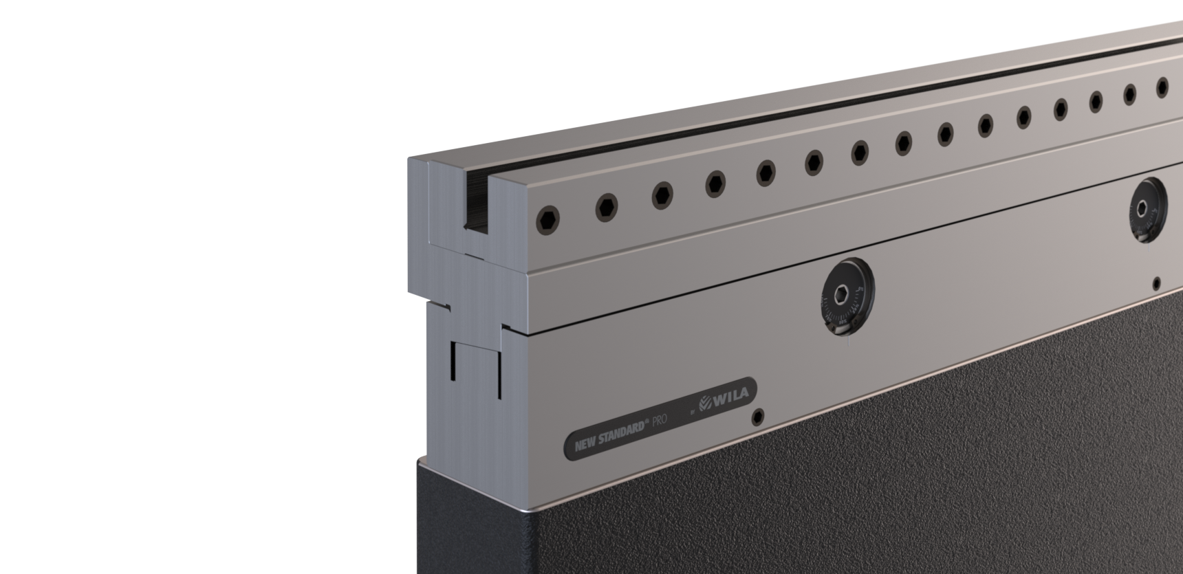 New Standard Premium Custom Style opspanbak Werkhoogte=110mm, Breedte=72mm, voorzien van UPB-gatenpatroon dat geschikt is voor de bevestigingsgaten volgens tekeningnr.: 31364, mechanische klemming d.m.v. klembouten M12 h.o.h. 25,5mm, Tx-uitlijning, Ty-uitlijning (handmatig d.m.v. één-punts-verstelling), Materiaal=CR-MO, druk- en aanlegvlakken CNC-diepgehard® (2-4mm / 56-60HRc), Gewicht=42.5kg/m, Max. belasting=300ton/m.geharde