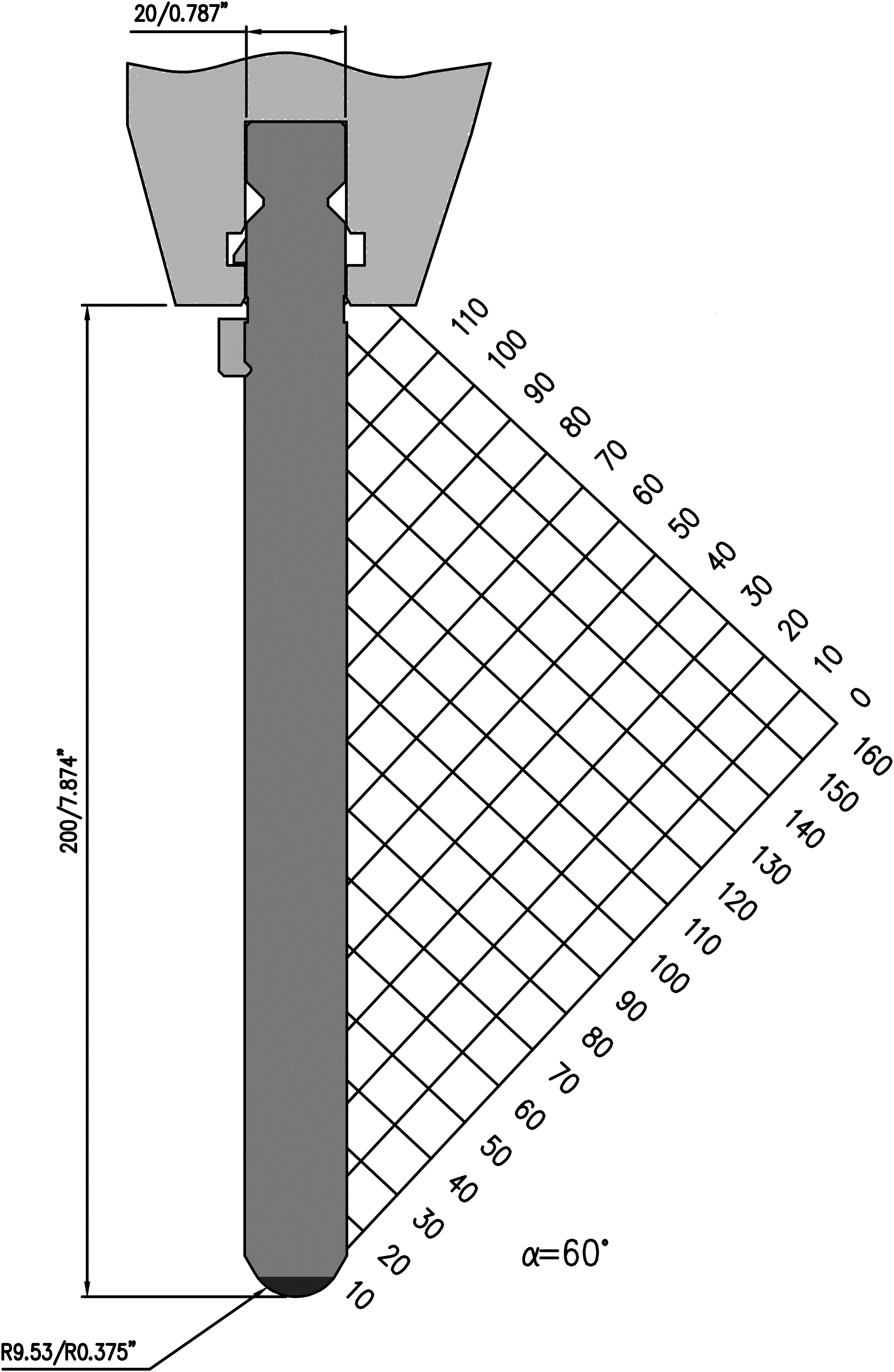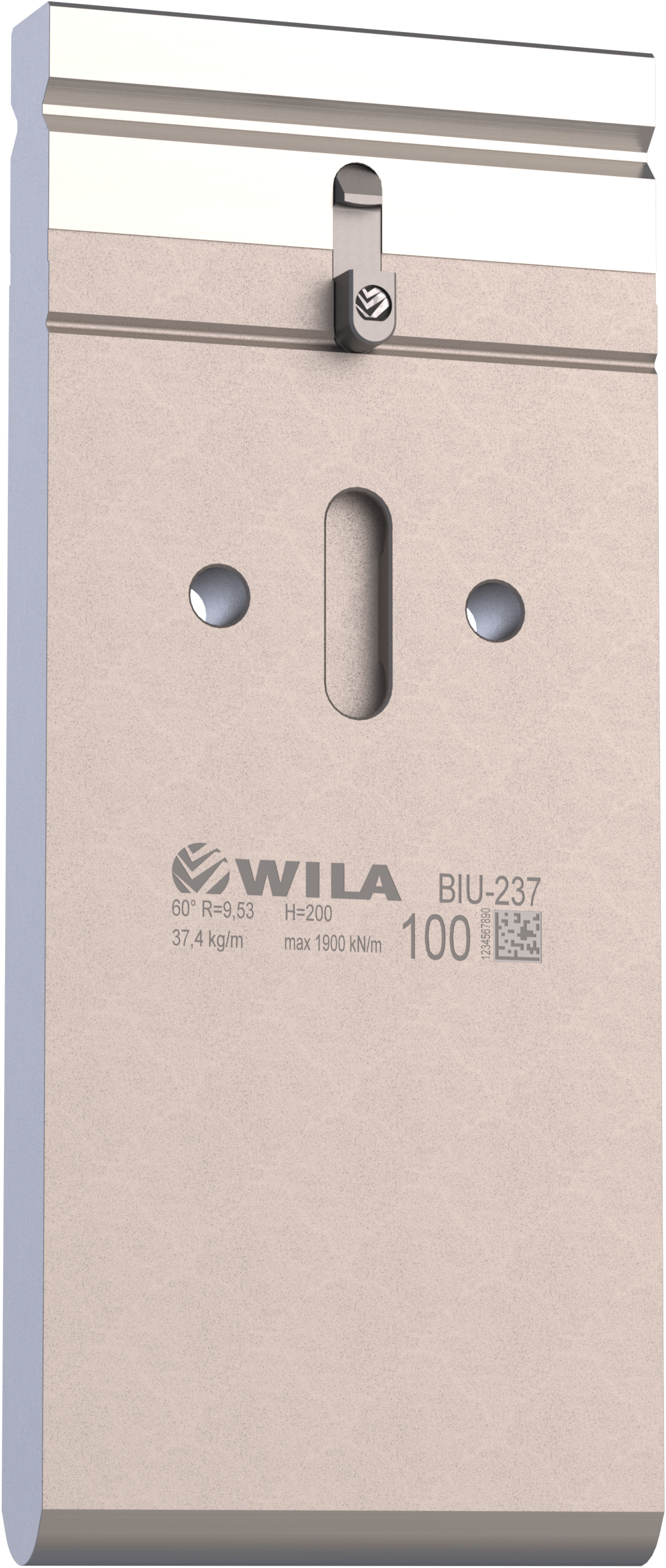 New Standard Premium bovengereedschap voorzien van WILA New Standard ATC, met Werkhoogte=200mm, α=60°, Radius=9.53mm CNC-diepgehard® (minimaal 4mm / 56-60HRc), Materiaal=CR-MO, Max. belasting=190ton/m. Voorzien van Safety-Clicks®, waardoor de gereedschappen snel, makkelijk en veilig verticaal te wisselen zijn.