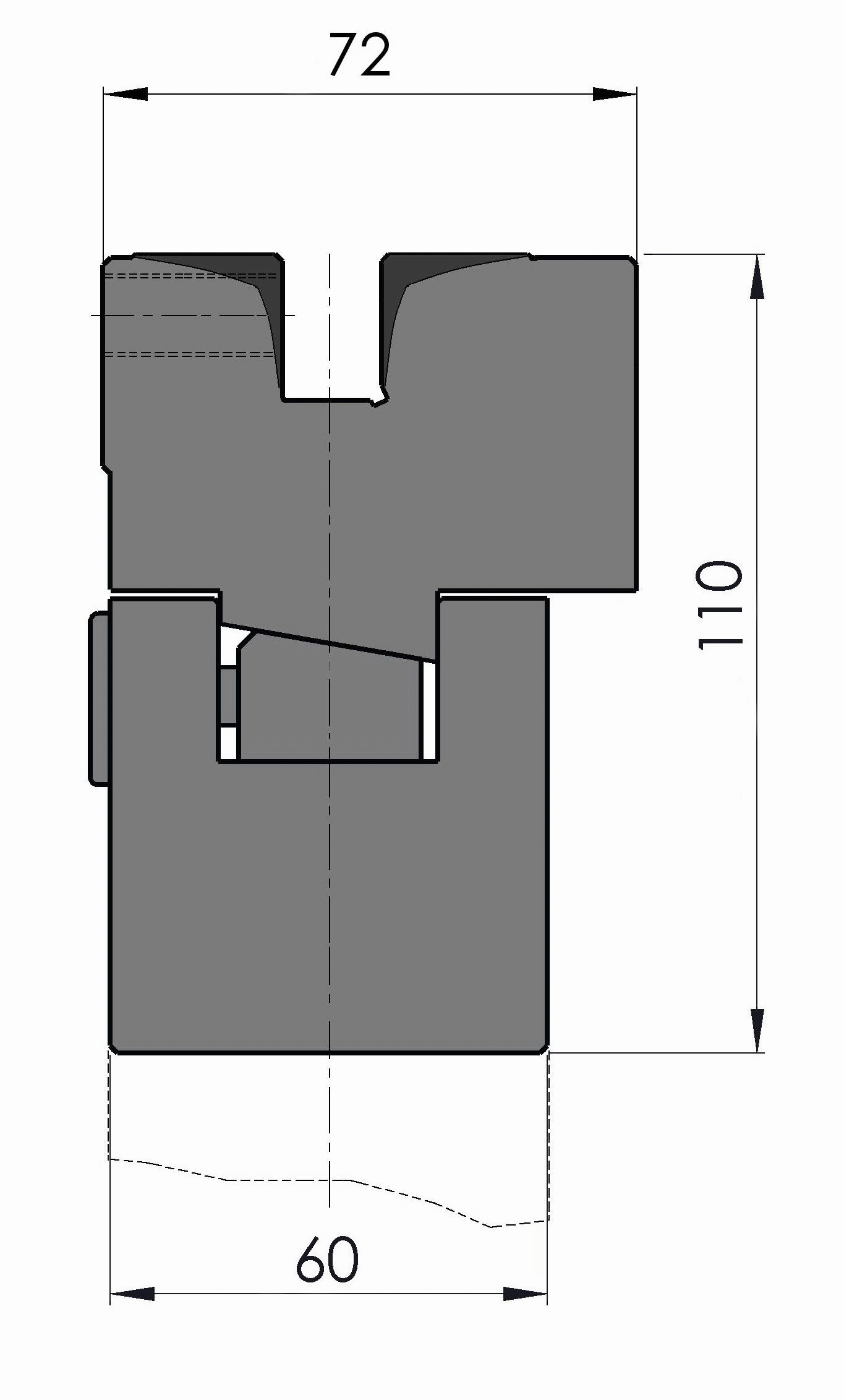 Working height=110mm, Width=72mm, provided with UPB-hole pattern which is suitable for the fixing holes according to drawing no.: 31364, mechanical clamping by means of set screws M12 pitch 25,5mm, Tx-alignment, Ty-alignment (manually by means of single point adjustment), Material=CR-MO, pressure and reference surfaces CNC-Deephardened® (2-4mm / 56-60HRc), weight: 42.5kg/m, max.load: 300ton/m.hardenend