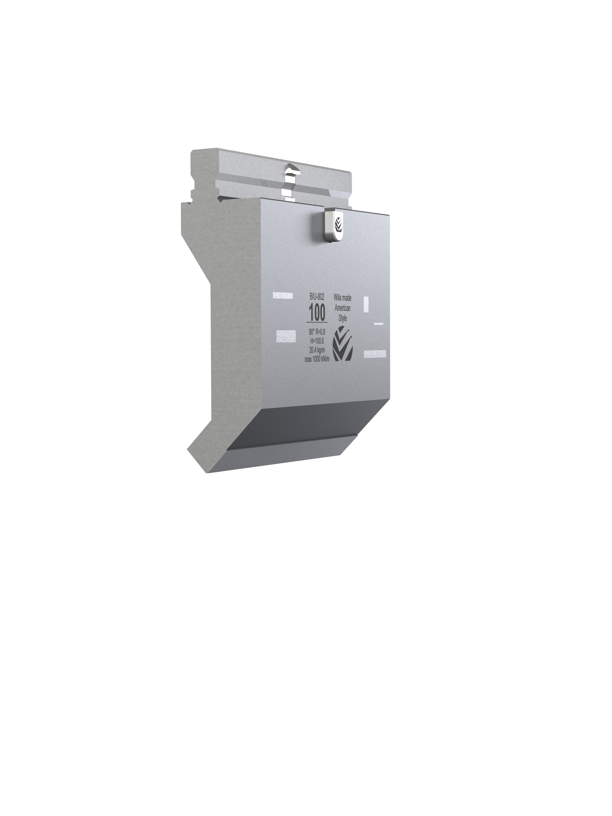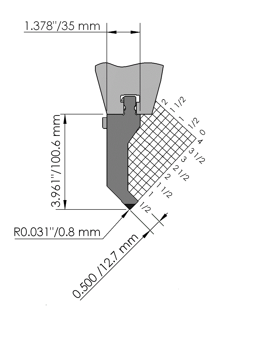American Style top tool with Working height H=100.4mm, α=90°, Radius=0.8mm, precision ground and CNC-Deephardened® (at least 4mm / 52-60HRc), Material=CR-MO, Max. load=100ton/m. Provided with Safety-Clicks™, which allows you to change the tooling vertically.