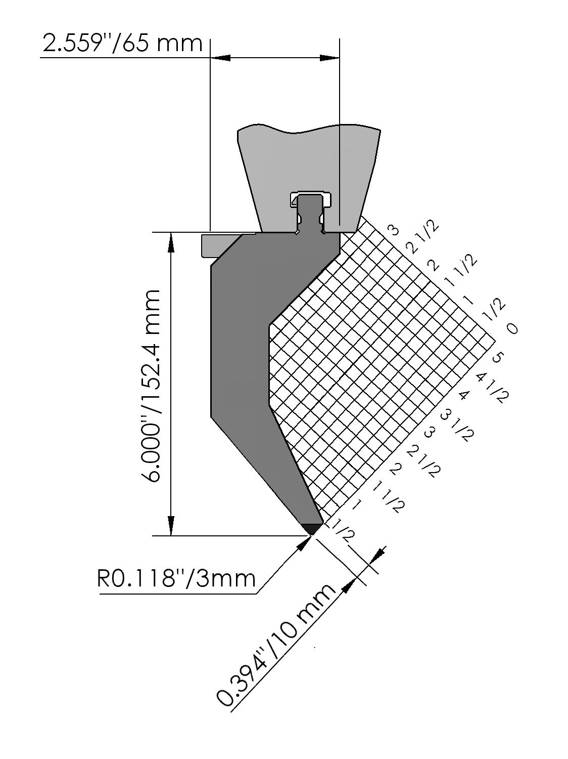 American Style top tool with Working height H=152.4mm, α=80°, Radius=3mm, precision ground and CNC-Deephardened® (at least 4mm / 52-60HRc), Material=CR-MO, Max. load=90ton/m. Parts <12.5kg provided with Safety-Clicks™, which allows you to change the tooling vertically; all other parts provided with fixed safety pins, which only allows you to change the tooling horizontally.