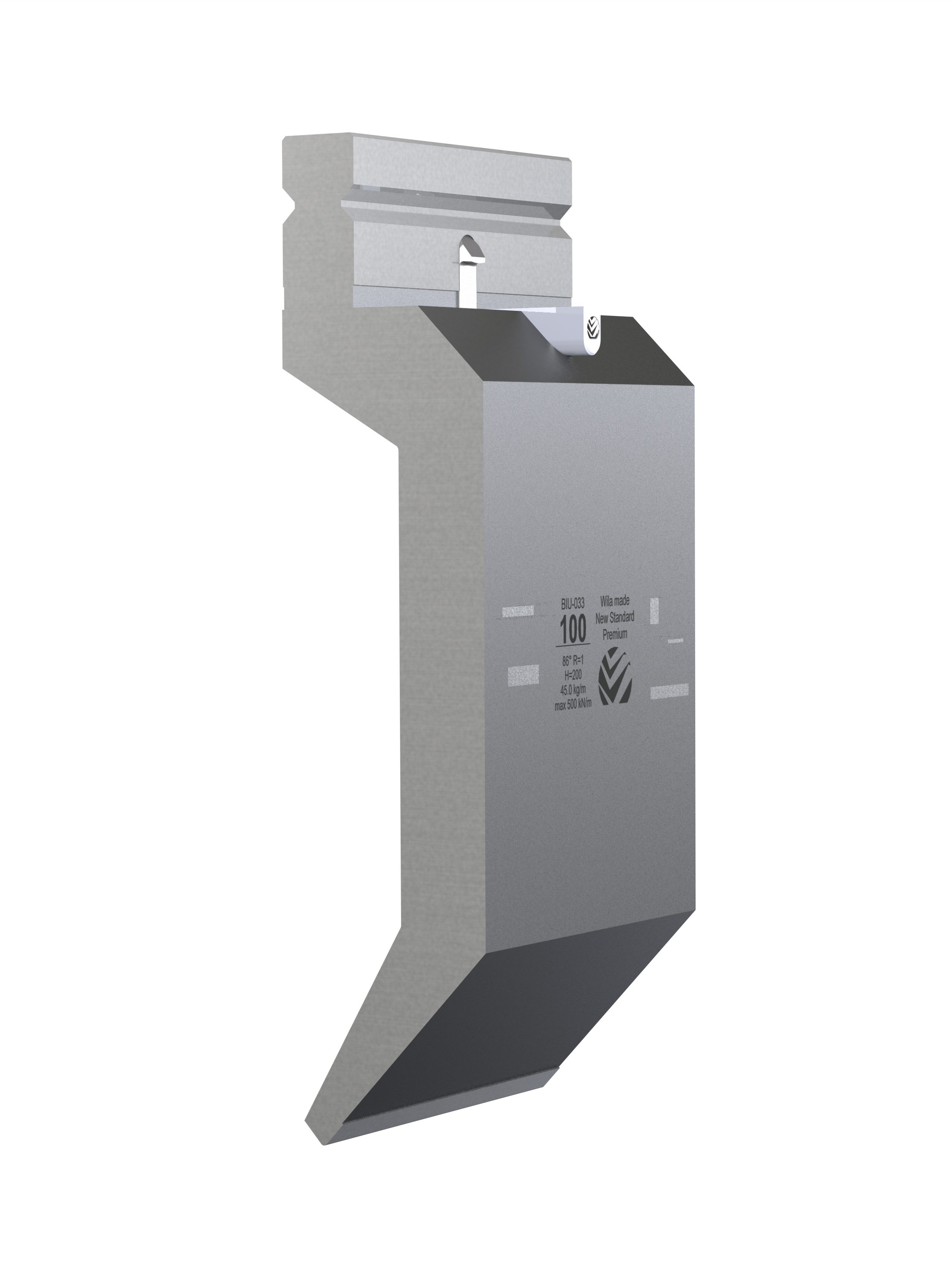 New Standard Premium top tool with Working height H=200mm, α=86°, Radius=1mm, precision ground and CNC-Deephardened® (at least 4mm / 56-60HRc), Material=CR-MO, Max. load=50ton/m. Parts <12.5kg provided with Safety-Clicks™, which allows you to change the tooling vertically; all other parts provided with fixed safety pins, which only allows you to change the tooling horizontally.