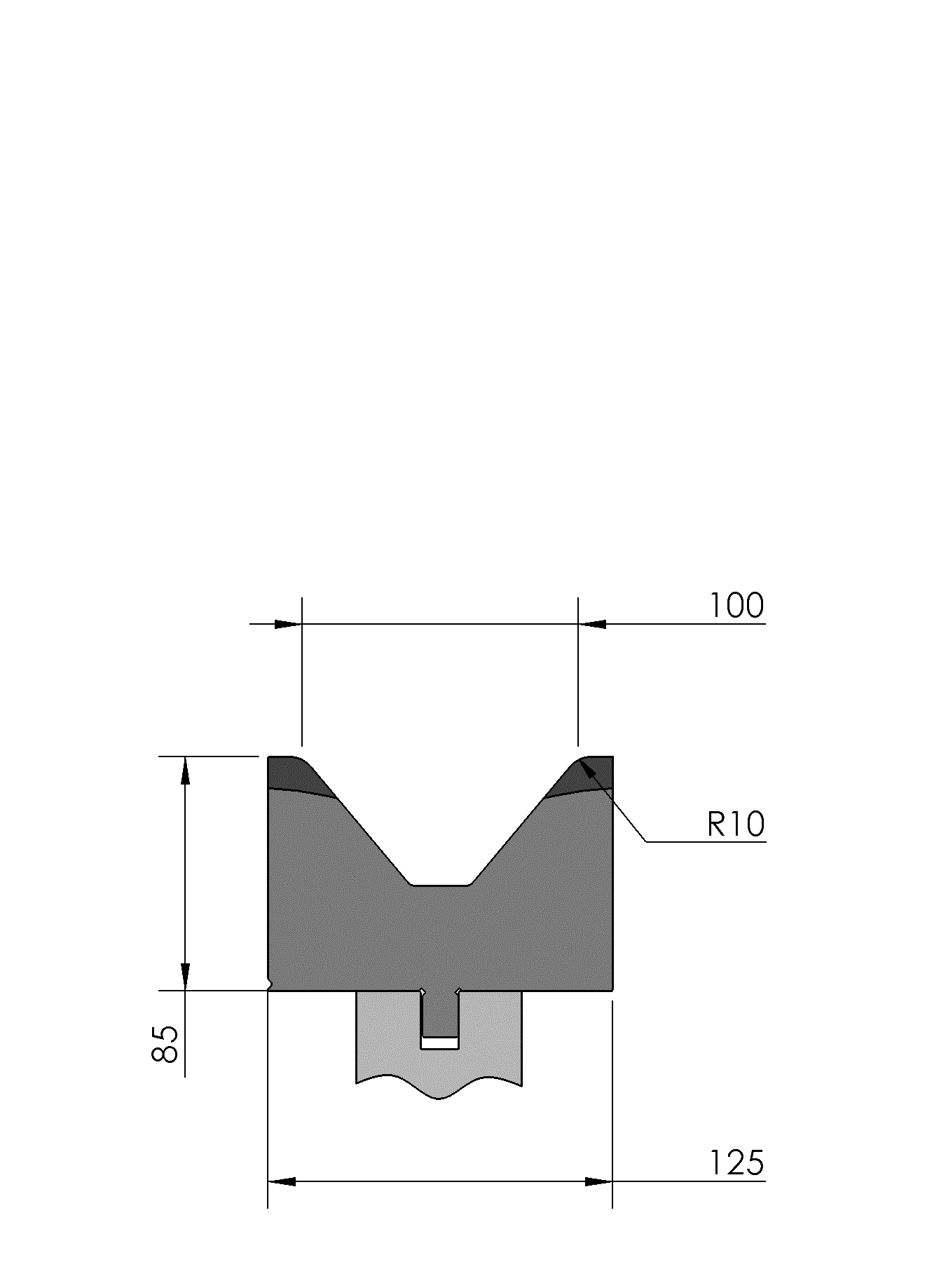 New Standard Premium bottom tool Working height=85mm, V-opening=100mm/80°, Bending radius=10mm, precision ground and CNC-Deephardened® (at least 4mm / 56-60HRc), Material=CR-MO