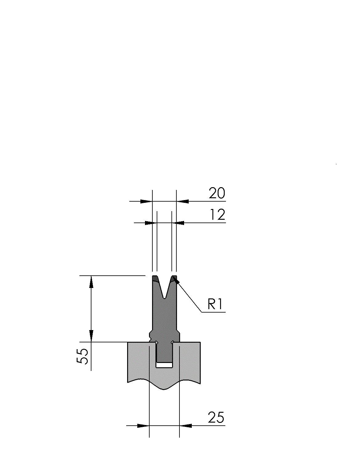 New Standard Premium bottom tool Working height=55mm, V-opening=12mm/30°, Bending radius=1mm, precision ground and CNC-Deephardened® (at least 4mm / 56-60HRc), Material=CR-MO