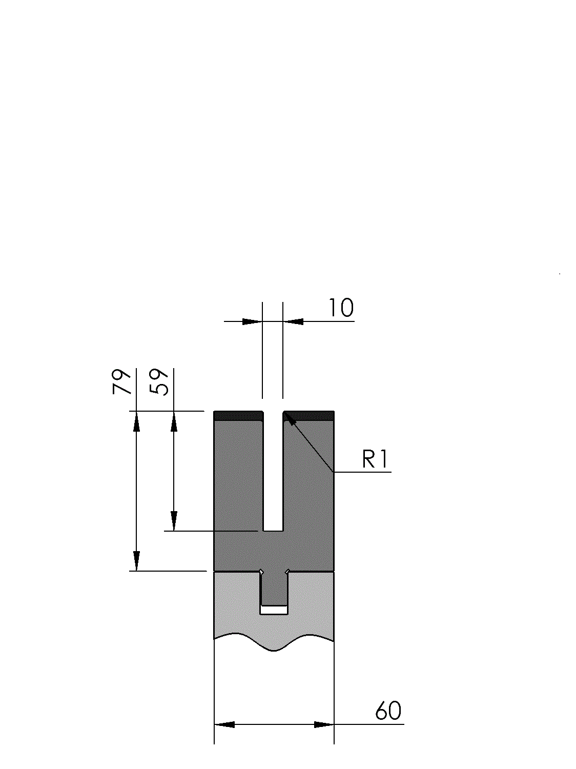 New Standard Premium bottom tool Working height=79mm, U-opening=10x59mm (BxD), Bending radius=1mm, precision ground and CNC-Deephardened® (at least 4mm / 56-60HRc), Material=CR-MO