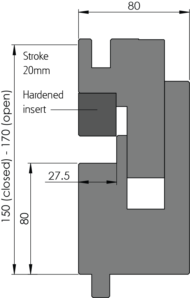 Adaptation type B2, suitable for max.3.00mm mild steel, 3.00mm aluminum, 2.00mm stainless steel and 3.00mm galvanized sheet , H closed=150mm, B=80mm, existing of: