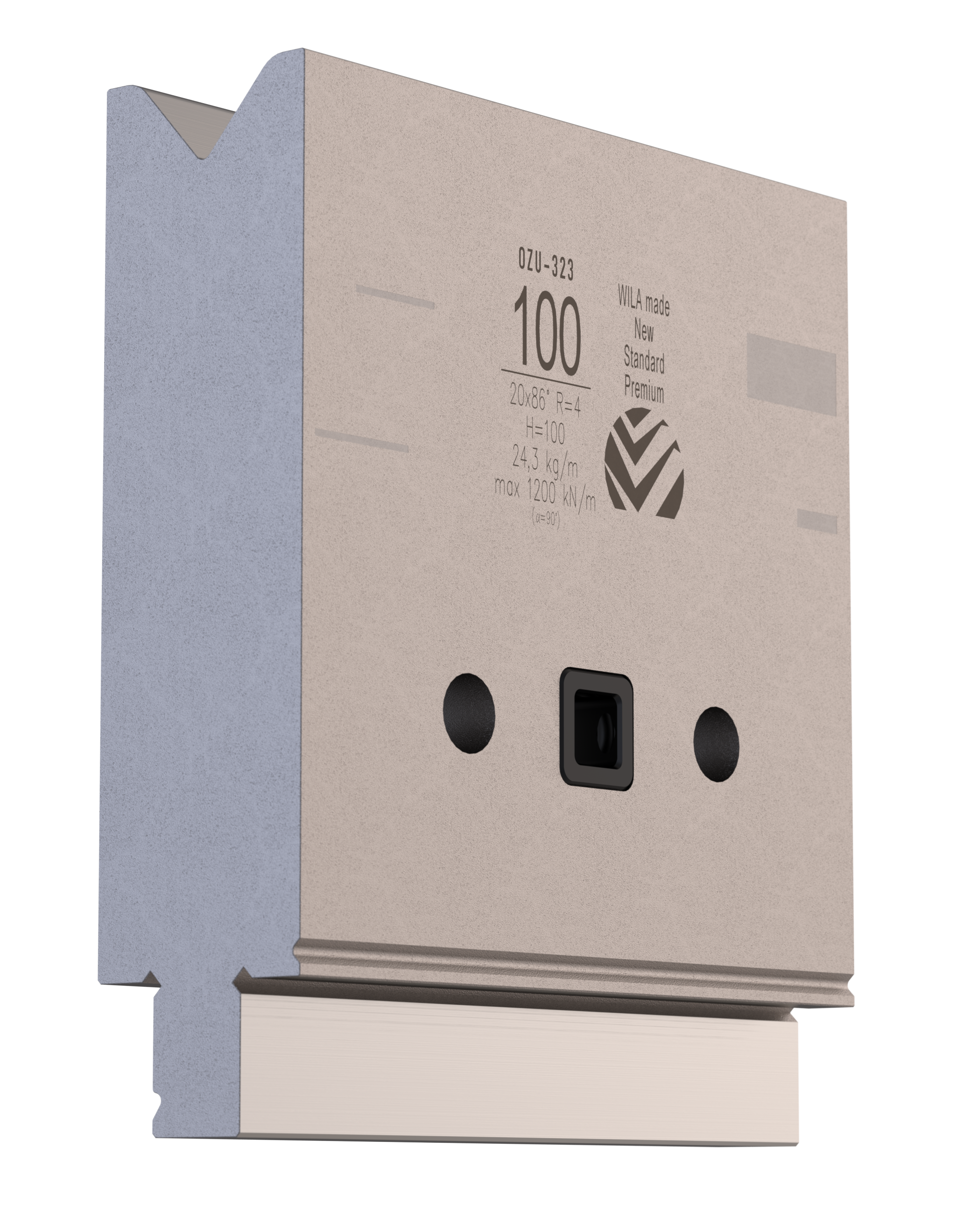 New Standard Premium bottom tool provided with ATC-adapter. Working height=100mm, V-opening=20mm/86°, Bending radius=4mm CNC-Deephardened® (at least 4mm / 56-60HRc), Material=CR-MO
